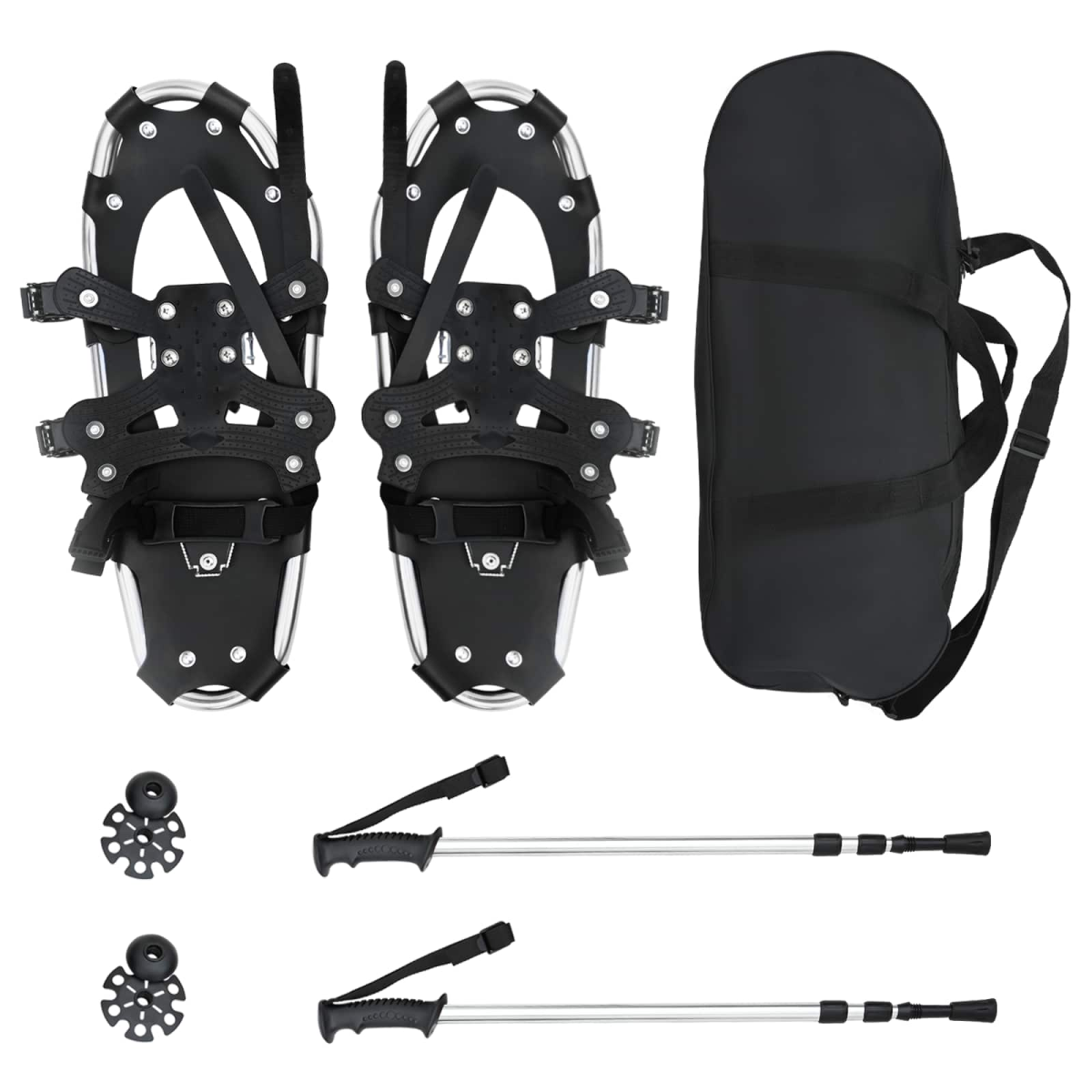 This 3 IN 1 Modern Snowshoe set with Hiking Poles is tailored for winter enthusiasts who crave adventure amidst snow. Emphasizing simplicity and functionality, it promises an effortless glide over snow-blanketed landscapes, making it perfect for outdoor aficionados. With its modern style, it attracts both beginner and expert snowshoe hikers looking for ease, agility, and thrilling winter expeditions. Aluminum Frame &Polyethylene Deck: Engineered for durability, the aluminum frame and polyethylene deck withstand the harsh outdoors, providing steadfast performance during snow hikes. Their resistance to cold ensures stability and strength, allowing enthusiasts to navigate through snow effortlessly. Complete Set: The package comes with a pair of snowshoes, two adjustable hiking poles, and a carrying bag, making it ideal for those seeking a full snow trekking kit in one purchase. Each component is designed for ease of transport and storage, ensuring you are adventure-ready at all times. Cold-resistant Features: The HDPE deck is crafted for cold settings, while the adjustable heel strap offers perfect foot alignment. This ensures your feet remain in place at all times for uninterrupted trekking, thus promoting safety and control on all terrains. Versatile Uses: Whether scaling mountaintops or trailing through secluded woods, it's built to accommodate shoe sizes 38 to 48 with a ratchet system for readjustment, lending flexibility to multiple users. Easy Maintenance: Store the gear in cool, dry places and wipe it with a dry cloth to maintain its pristine condition. Avoid pavement walks to preserve deck integrity and inspect before each seasonal use for sustained functionality.