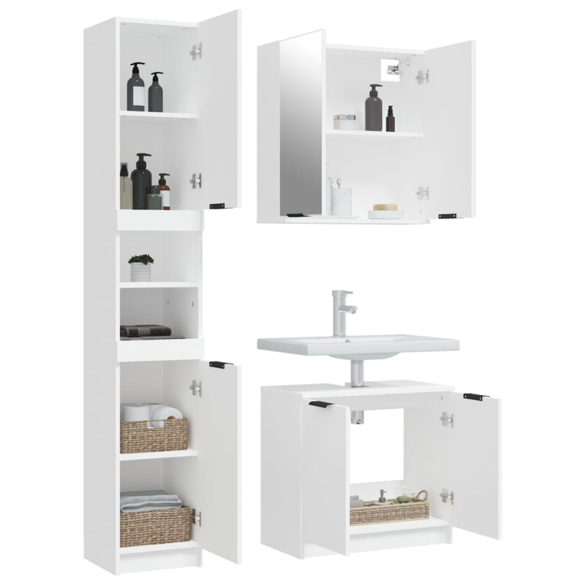This attractive bathroom cabinet set, with ample storage space, features a stylish yet practical design. Easy-to-clean material: The engineered wood is of exceptional quality with a smooth surface and features strength, stability and resistance to moisture. Ample storage space: The storage space makes this bathroom furniture set easy to keep things organised. Stylish design: The clean lines and sleek design blend into your bathroom perfectly. Note:Screw(s) and plug(s) for inside the wall are not included. Seek and use screw(s) and plug(s) suitable for your walls. If you are uncertain, seek professional advice. Read and follow each step of the instruction carefully. Each product comes with an assembly manual in the box for easy assembly. Warning:In order to prevent overturning, this product must be used with the wall attachment device provided.