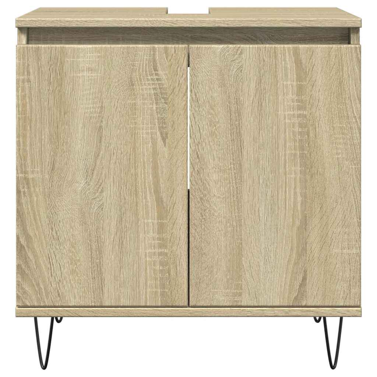This stylish bathroom furniture set is an excellent addition to your bathroom, giving it a tidy and striking appearance! Durable material: The engineered wood is of exceptional quality with smooth surface and also features strength, stability, and resistance to moisture.Ample storage space: This bathroom furniture offers ample storage space to easily accommodate your essential toiletries and bath items, such as soaps, shampoo, toothpaste, etc.Iron feet: The iron feet add an industrial style to your interior while ensuring the stability of the bathroom storage cabinet.Practical door: Keep your space clutter-free by hiding small essentials behind the door of this bathroom cupboard. And the door can be assembled on the left or right as per your preference. Good to know:Screws and plugs for inside the wall are not included. We advise you to find and use screws and plugs suitable specifically for your walls. If you're not sure, you can consult with a professional. Please read and follow each step of the instructions. Warning:To prevent it from tipping over, this product must be used with the provided wall attachment device.