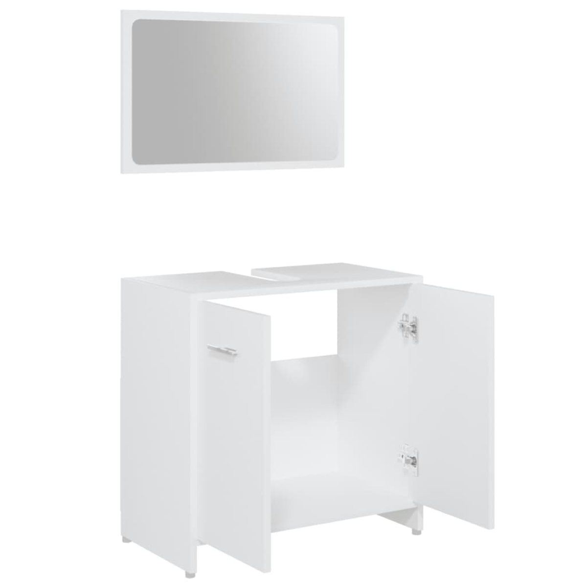 This stylish bathroom furniture set, featuring 1 medium cabinet, 1 under basin cabinet and 1 mirror, creates additional storage space for your bathroom with a stunning and neat appearance. Made of premium engineered wood, this set is durable and stable. The chic medium cabinet has 3 compartments and 1 door, offering spacious space to store items in your bathroom. The basin cabinet has 1 compartment and 2 doors, providing ample space to store your toiletries, beauty products and various kinds of smaller items. You can even organise combs, cosmetics, toothbrushes and toothpaste in the Shelf conveniently within reach. The mirror adds an excellent appearance to your existing home decor. Additionally, this bathroom set is easy to clean with a damp cloth.