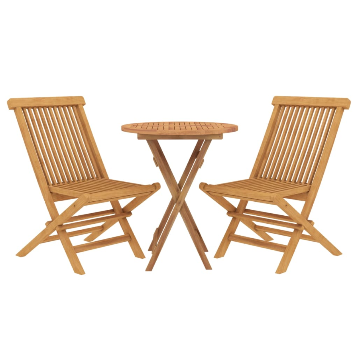 This wooden garden dining set, featuring an elegant design, is an excellent choice for your dining or lounging on your patio or garden. Solid teak wood: Solid teak wood is a beautiful natural material. It has been seasoned, kiln dried and then fine sanded to give a very smooth appearance. Teak wood is known for its exceptional strength and weather resistance.Sturdy frame: The wooden frames ensure sturdiness and stability.Foldable design: These wooden chairs and table can be easily folded away when not in use. Note:In order to extend the life of your outdoor furniture, we recommend you to clean it regularly and do not leave it outdoors without protection unnecessarily.Clean: Use a mild soap solution.Storing: If possible, store in a cool, dry place indoors. If the product is stored outdoors, protect it with a waterproof cover. Wipe and dry the excess water or snow from flat surfaces after a rain or snowfall. Allow sufficient air circulation to avoid moisture-related damage.