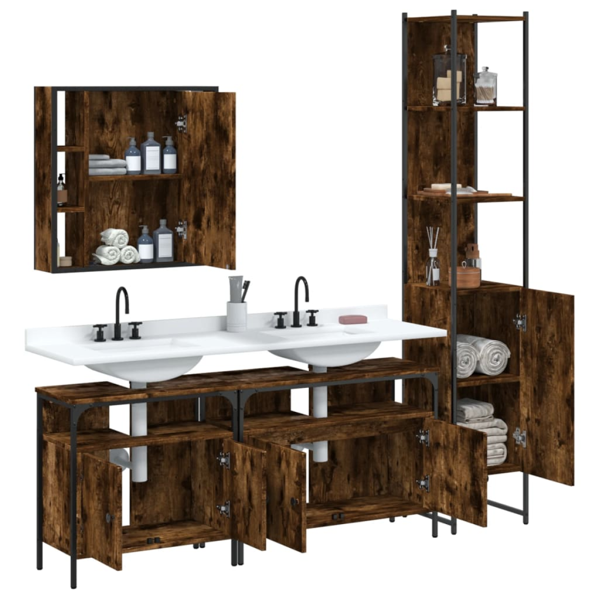 This attractive bathroom cabinet set, with ample storage space, features a stylish yet practical design. Sturdy construction: The powder-coated steel and engineered wood ensure sturdy construction and provide your items with strong support.Ample storage space: This bathroom furniture offers ample storage space to easily accommodate your essential toiletries and bath items such as soaps, shampoo, toothpaste, etc.Extra storage shelf: The bath mirror features a bottom shelf that offers extra storage space for placing your bathroom supplies like toothbrushes, facial cleansers, razors, etc.Clear image: The glass mirror face provides a fine and non-distorted reflection, so it is suitable for making up, shaving or checking the suit before going out.Adjustable feet: The adjustable feet with plastic pads keep the bathroom cabinet balanced on uneven ground and increase stability. Warning:To prevent it from tipping over, this product must be used with the provided wall attachment device. Good to know:Screws and plugs for inside the wall are not included. We advise to find and use screws and plugs suitable specifically for your walls. If you're not sure, you can consult with a professional. Please read and follow each step of the instructions.