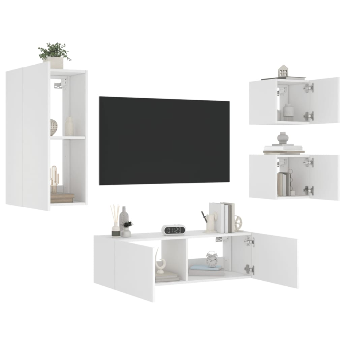 These TV wall cabinets with LED lights are the perfect solution for your living space to maximise space and keep the floor areas uncluttered. Durable material: The engineered wood is of exceptional quality with smooth surface and also features strength, stability and resistance to moisture. Made of engineered wood, these floating TV units are sturdy and durable.Ample storage space: The TV wall units have ample storage space to place your DVD players, books, magazines or other decorative items.RGB LED lights: The wall media units are equipped with vibrant RGB LED lights. With various customisable menus, you can effortlessly change the colour of the lights and even set them to adjust automatically.Wall-mounted design: These TV units with storage can be wall-mounted to add extra storage space. That way, you can maximise your floor space and keep the area clean. Good to know:Screws and plugs for inside the wall are not included. We advise to find and use screws and plugs suitable specifically for your walls. If you're not sure, you can consult with a professional. Please read and follow each step of the instructions.The product has a USB connector that requires a certified 5V USB power source (not included).