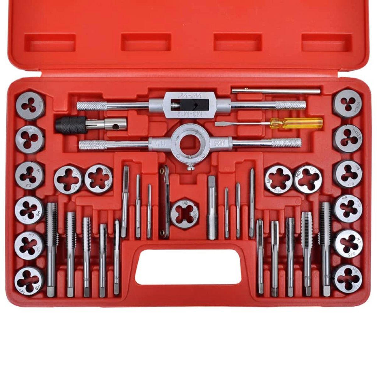 This 40-piece practical tap and die set is perfect for cleaning and cutting internal and external threads, and can be used for automotive and general mechanical workshop purposes. Manufactured from high-quality carbon steel, the tools are heat treated and tempered for strength and durability. Thanks to the included convenient carrying case, these tools are easy to transport and do not take up too much storage space. Delivery includes 1 x gauge, 1 x tap wrench M3-M12, 1 x die wrench, 1 x screwdriver, 1 x tap wrench M26, 1 x thread pitch gauge, 17 x taps and 17 x dies.