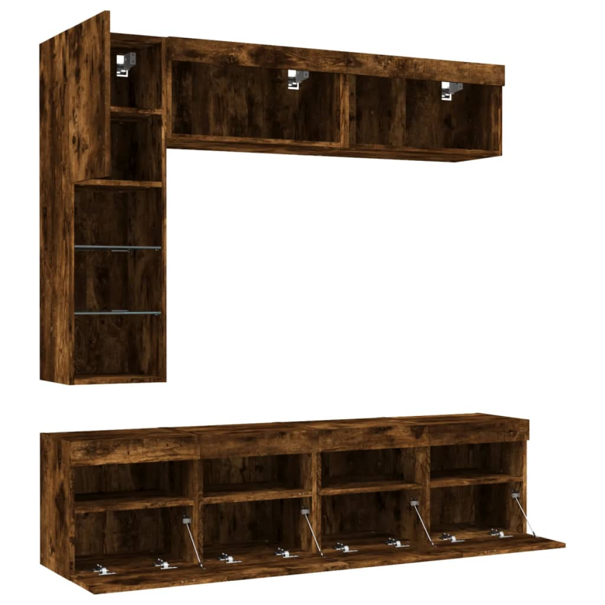 This TV wall cabinet set is a perfect solution for your living space to maximise space and keep the floor areas uncluttered. Sturdy material: The engineered wood is of exceptional quality with a smooth surface and also features strength, stability and resistance to moisture.RGB LED lights: The wall media unit is equipped with vibrant RGB LED lights. With various customisable menus, you can effortlessly change the colour of the lights and even set them to adjust automatically. These LED lights not only enhance the contemporary look of the floating TV unit but also add to its trendy appeal.Wall-mounted design: The LED cabinet can be wall-mounted to add extra storage space. That way, you can maximise your floor space and keep the area clean.Ample storage space: The TV wall unit provides ample space to store your daily essentials such as books, DVDs, magazines, media supplies and other items neatly organised and within easy reach.Versatile design: You can use it as a TV cabinet or mount it on the workplace wall for convenient storage of tools or other miscellaneous items. Also, it transforms an empty wall into a design feature. Good to know:Screws and plugs for inside the wall are not included. We advise to find and use screws and plugs suitable specifically for your walls. If you're not sure, you can consult with a professional. Please read and follow each step of the instructions.The product has a USB connector that requires a certified 5V USB power source (not included).