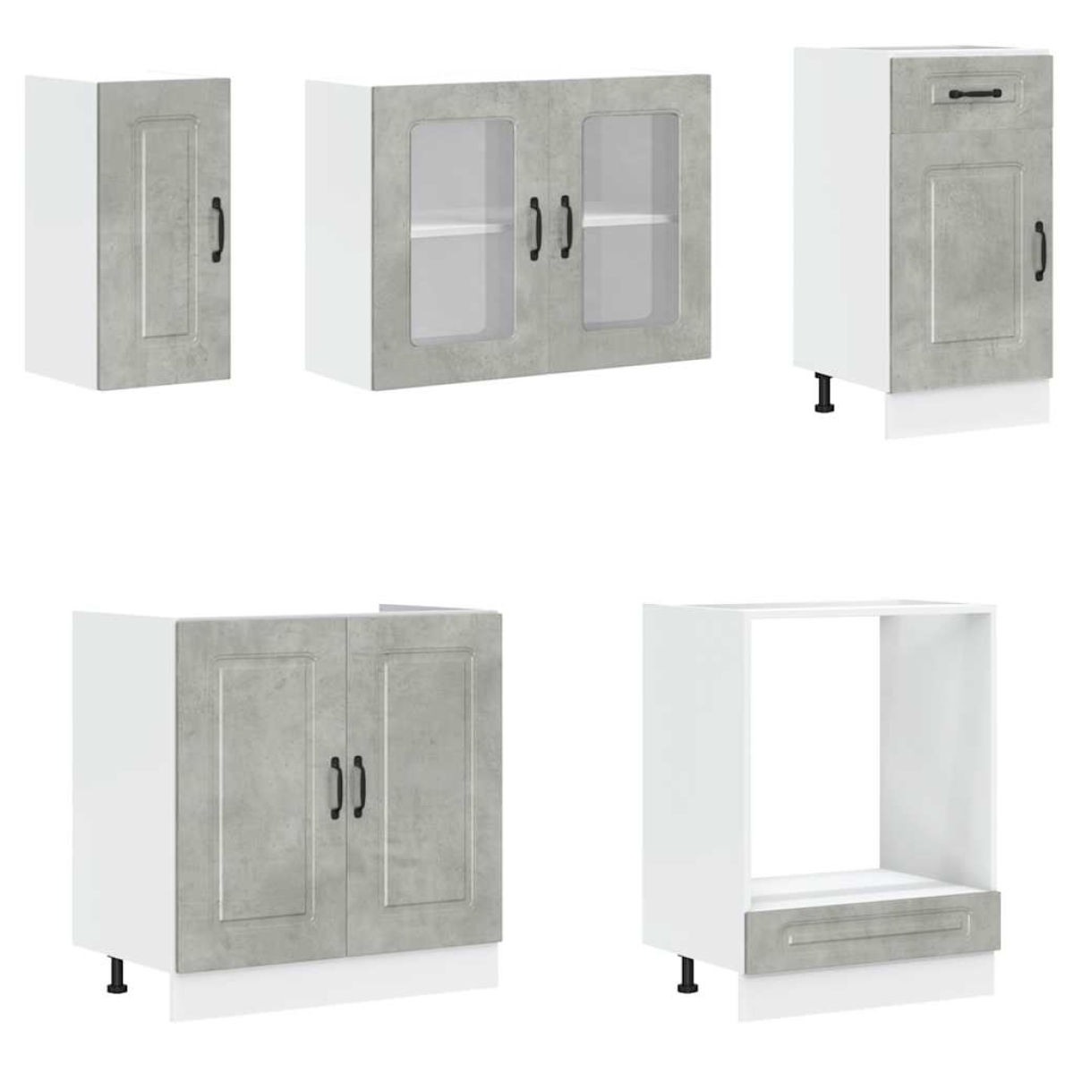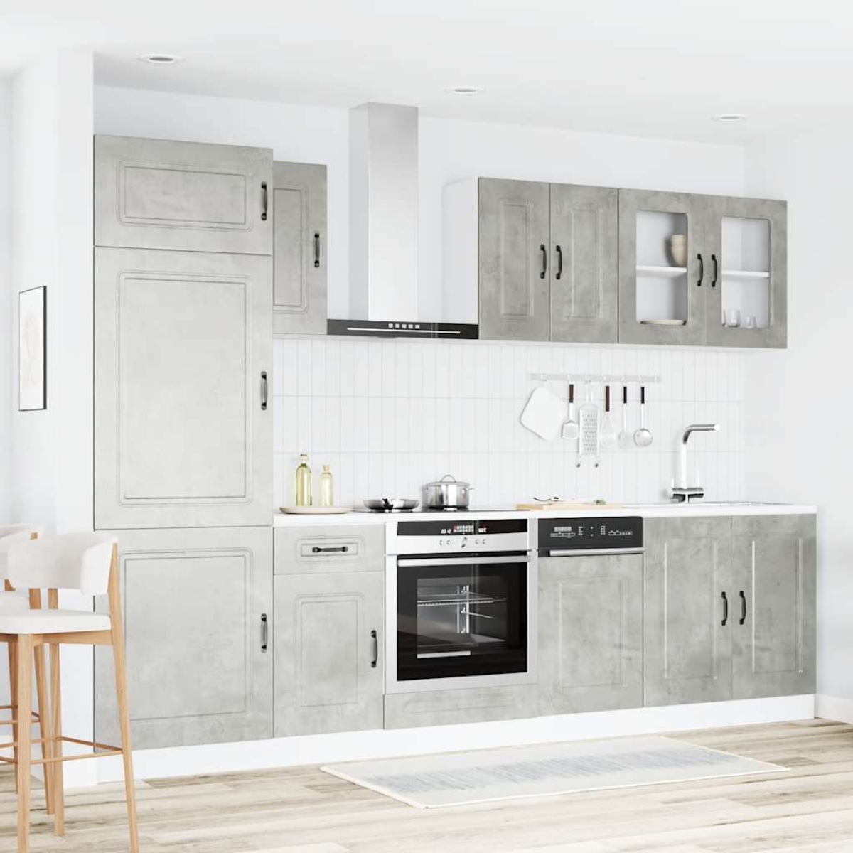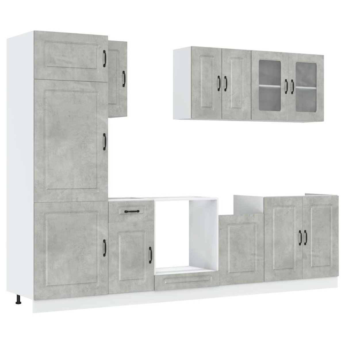 This 8-piece kitchen cabinet set, with its elegant design, optimises your kitchen space and provides ample storage space for your personal belongings! Stable and durable material: Engineered wood is a durable and stable material with a smooth surface that is resistant to moisture, warping, and splitting, making it a reliable choice for a variety of projects.Ample storage space: The kitchen cabinet set has many compartments, and offers sufficient space to store bowls, plates, pots, and other kitchen appliances.Adjustable feet: The bottom cabinets feature adjustable feet that can be adjusted in height to suit your kitchen layout.Easy to maintain: Thanks to its smooth surface, these kitchen cabinets are easy to clean with a damp cloth and require less maintenance. Warning:This product must be secured by installing a worktop. Good to know:Screw(s) and plug(s) for inside the wall are not included. Seek and use screw(s) and plug(s) suitable for your walls. If you are uncertain, seek professional advice. Read and follow each step of the instruction carefully.The worktop, sink and faucet are not included in the delivery.