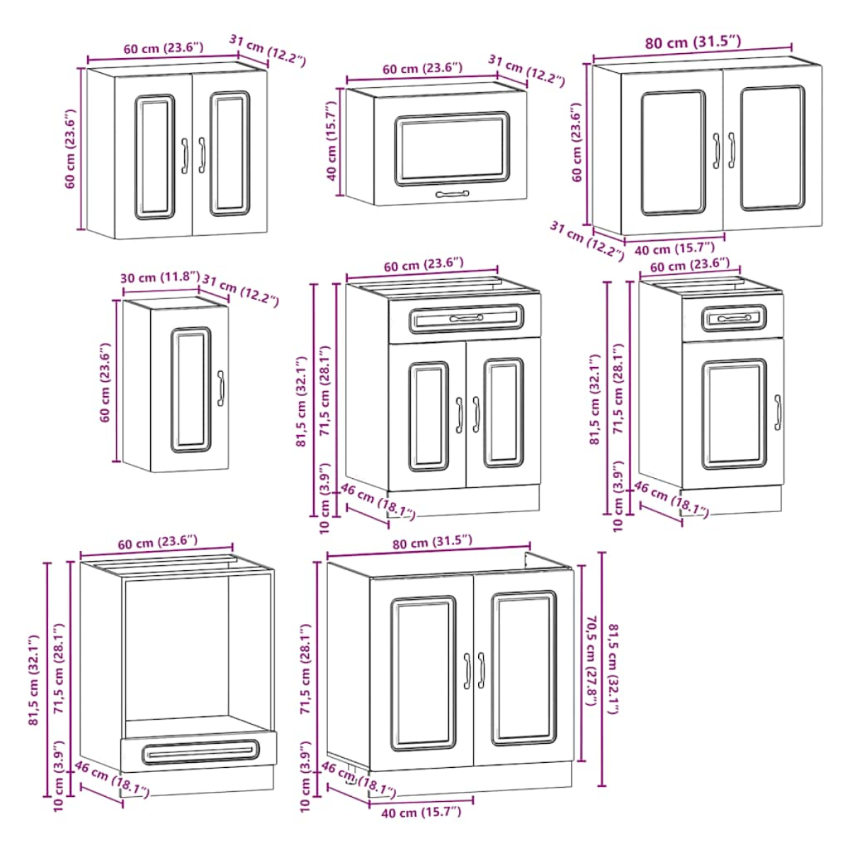 - 1 x Sink base cabinet: 80 x 46 x 81.5 cm (W x D x H)