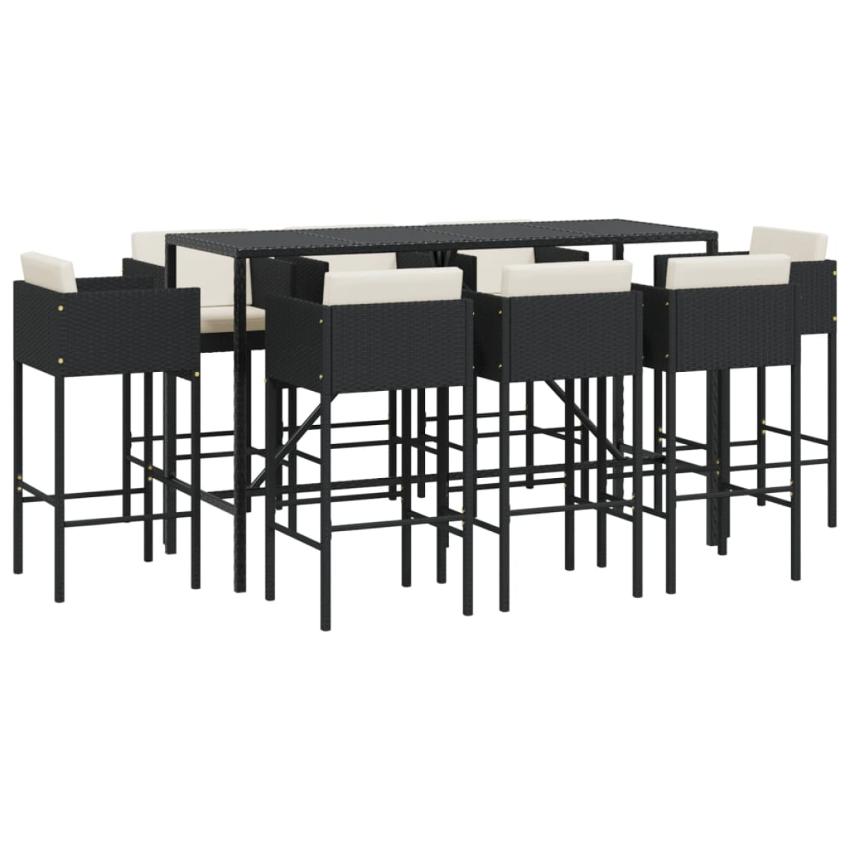 This trendy garden bar set, combining both style and function, is surely meant to be the centrepiece of your garden, patio, and any other living space. Weather-resistant material: PE rattan, also known as poly rattan, is weather resistant and easy to clean. It remains beautiful on the outside for a long period of time. It offers great quality, convenience and an aesthetic look.Sturdy and stable frame: The powder-coated steel frames make the bar table set sturdy and stable for daily outdoor use.Comfortable seating: The bar stool is designed with footrest, backrest and armrests to offer you a comfortable seating experience. The soft seat and back cushions also add extra comfort.Tempered glass tabletop: The tabletop of the bar table is made of tempered glass, making it easy to clean. Additionally, it offers excellent support for holding your drinks, snacks, and your favourite decorations. Good to know:To make sure your outdoor furniture stays beautiful, we recommend protecting it with a waterproof cover.