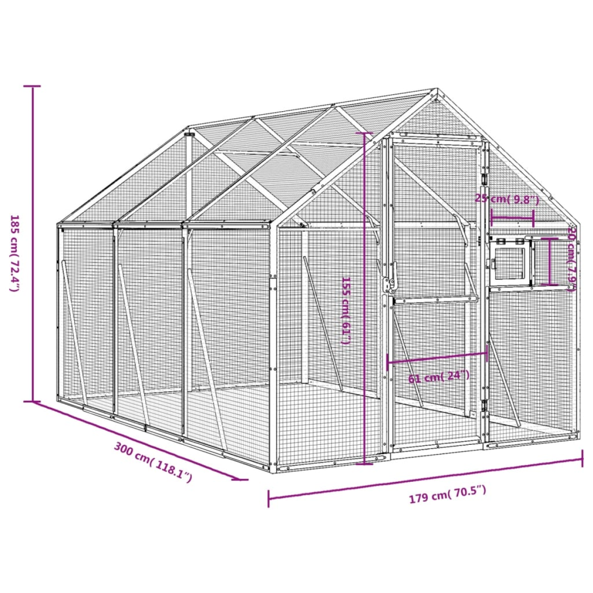 This aviary provides a cosy and comfortable place for your birds to fly and play safely. Sturdy frame: Aluminium metal is lightweight and strong. It's resistant to corrosion with a self-protecting oxide layer. Thanks to the sturdy aluminium construction, this bird aviary is built to last.Wire mesh gird: The budgie cage is equipped with wire mesh grids that prevent mischief and unexpected accidents. In addition, they also allow you to observe your birds daily and guarantee your birds a wide field of view and enough fresh air.Ample activity room: The parrot cage provides your birds with ample activity room to walk around, play and fly around with ease. Besides, it is also suitable for other small animals such as rabbits, ducks, chickens, geese, etc.Lockable door and window: The hinged door with a lockable latch system of the large bird cage ensures extra security and safety for your birds. The large parrot cage also has a lockable window for easy feeding.