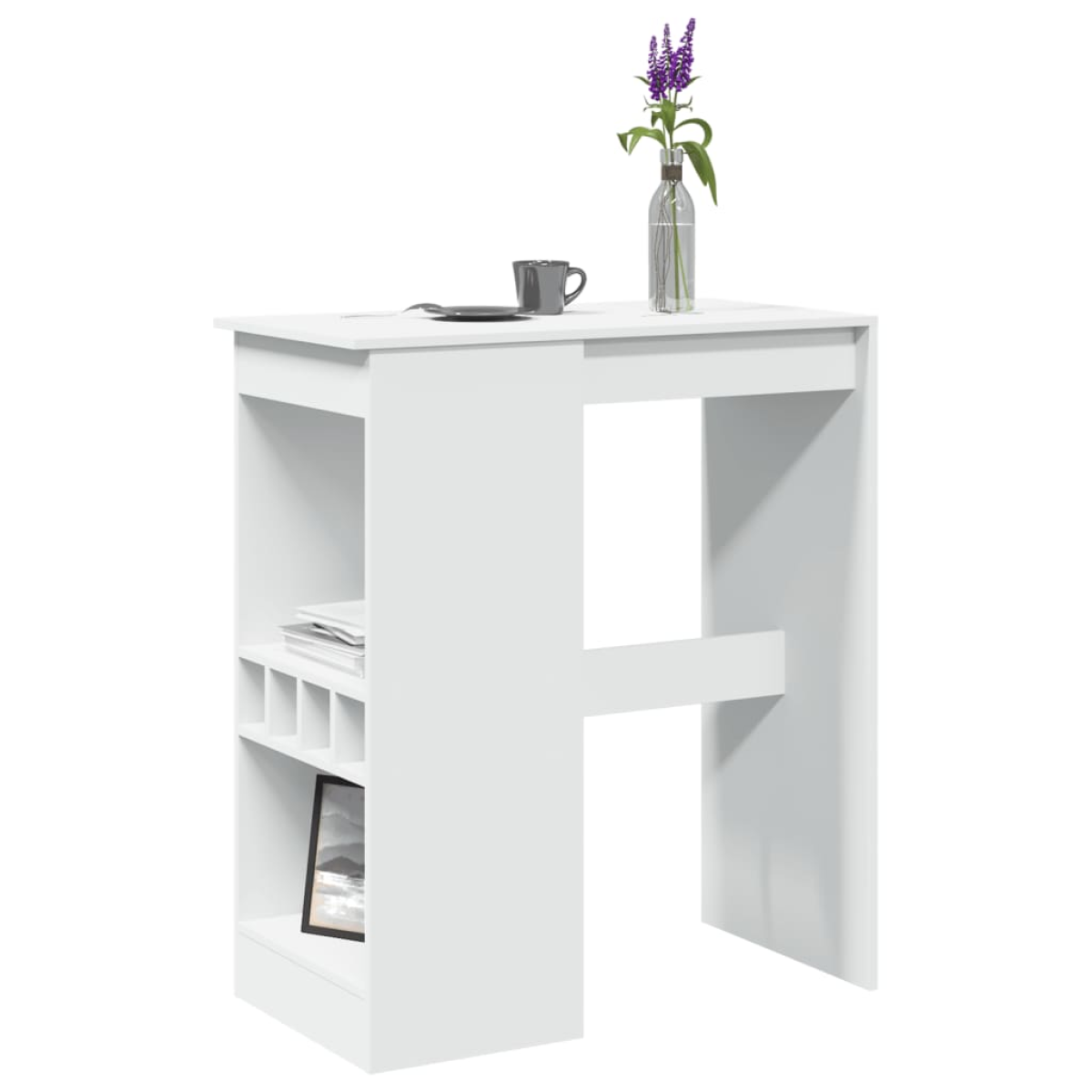 Choosing this bar table adds both aesthetics and practicality to your space. Stable and durable material: Engineered wood is a durable and stable material with a smooth surface that is resistant to moisture, warping, and splitting, making it a reliable choice for a variety of projects.Integrated wine holders: The bar cabinet includes four built-in wine holders that store drinking bottles, ensuring you always have your favourite drinks within easy reach.Versatile placement: Whether in the kitchen, living room, or dining area, this tall table enhances any space. Its inviting design encourages lingering, making it a perfect centrepiece for intimate gatherings and casual conversations.Easy maintenance: Thanks to its smooth surface, the pub table is easy to clean with a damp cloth and requires less maintenance. Warning:To prevent it from tipping over, this product must be used with the provided wall attachment device. Good to know:Screws and plugs for inside the wall are not included. We advise you to find and use screws and plugs suitable specifically for your walls. If you're not sure, you can consult with a professional. Please read and follow each step of the instructions.