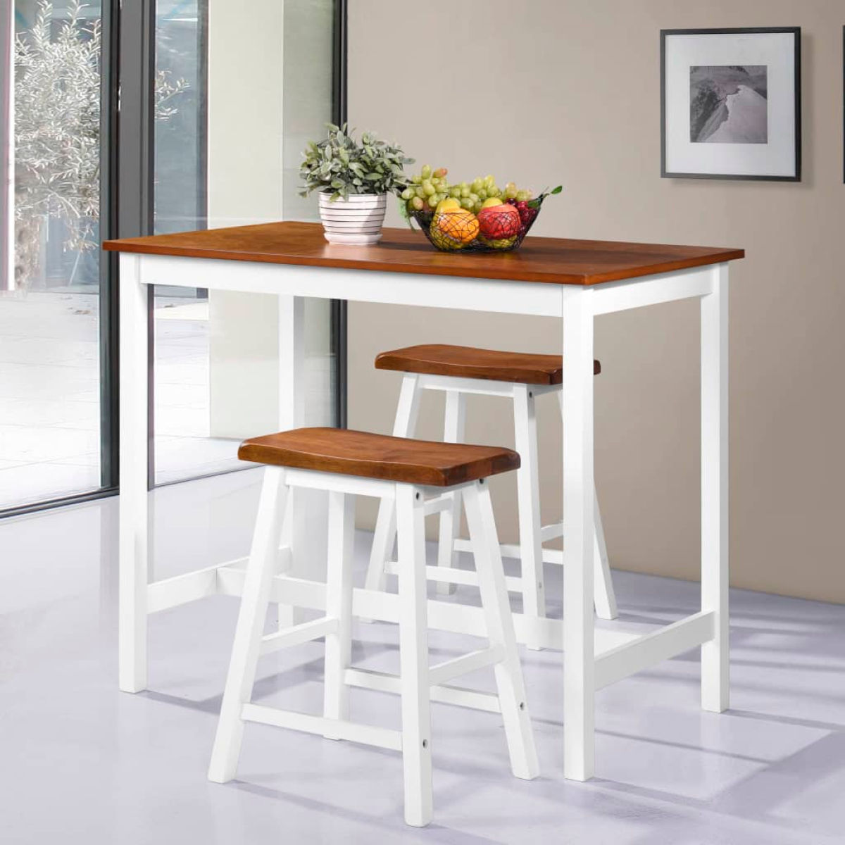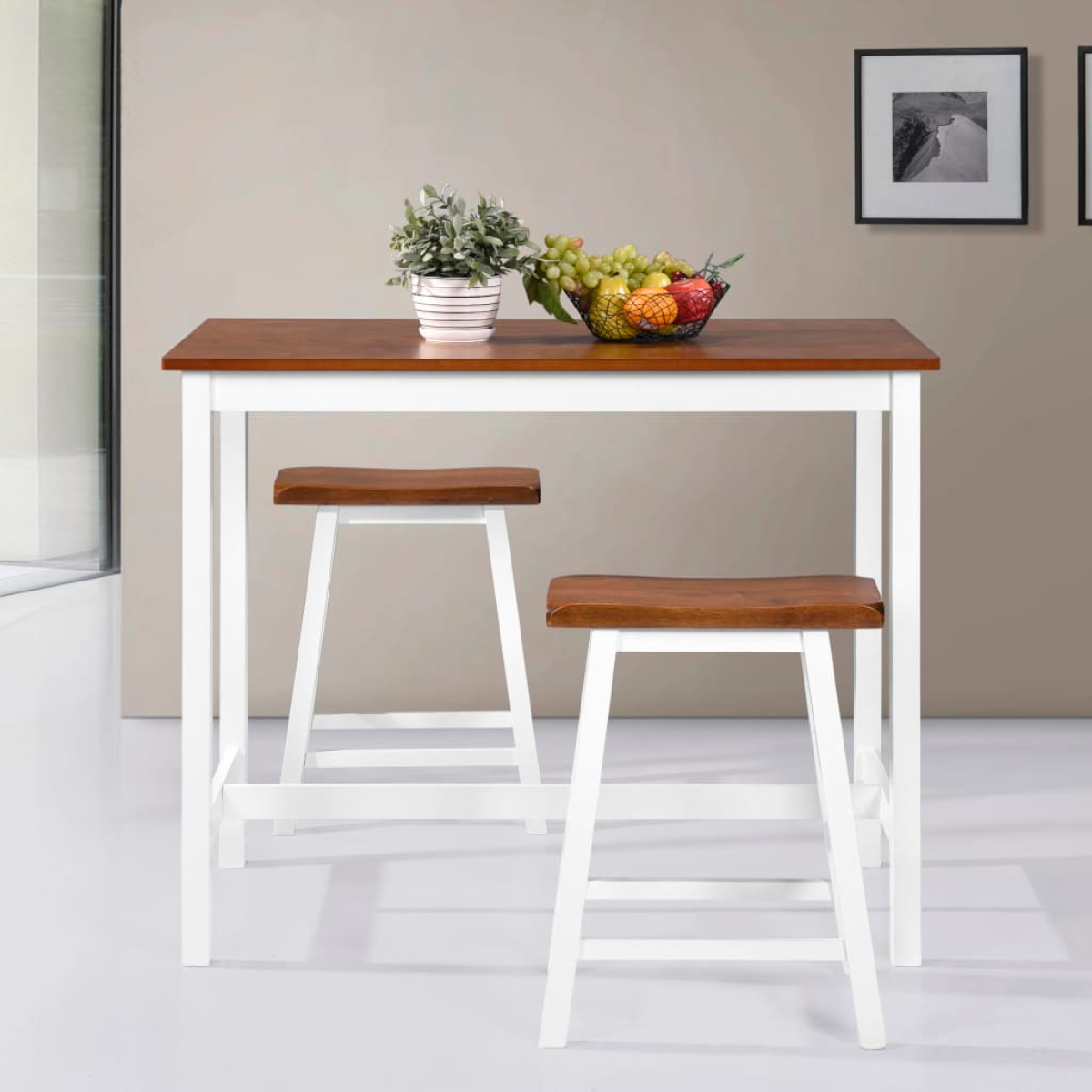 This bar set consists of 1 table and 2 stools and will make a practical as well as decorative addition to any home, bar or restaurant. This bar table has an MDF tabletop and solid wooden legs and the stools are completely made of solid wood for sturdiness and durability. The bar set has been given a beautiful finish by sanding, painting and lacquering to give it a refined look. The table and stools are easy to clean with a damp cloth. Assembly is easy.