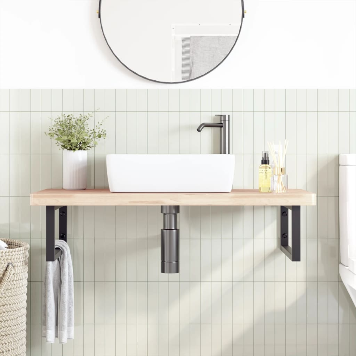 The wall mounted basin shelf securely attaches to the wall, providing an elegant and space-saving solution for your bathroom. Sturdy and long-lasting: This basin shelf is combined with a steel structure and a solid beech wood top, making it sturdy, stable, and long-lasting. Space-saving: The floating basin shelf has ample space to store creams and small items. Thanks to the rectangular shape, you can hang towels or other things on the support to save space. Easy to use: The countertop comes undrilled to allow the basin to be mounted on the left, right, or in the centre, depending on your room's requirements. Thanks to the pre-drilled holes in the holder, it can be easily assembled with the tabletop and mounted on the wall. Wide applications: Thanks to its modern design, it provides additional space for various types of bathrooms. Good to know:Screws are not included, you can purchase the screws separately based on the information provided below. Wall attachment: 2 pcs M8 expansion screws per bracket Wooden top: 2 pcs M5x18 screws (T=2) or 2 pcs M5x20 screws (T=2,5/4cm) per bracket