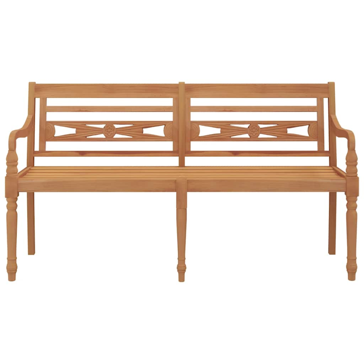 Add a touch of elegance to your outdoor living space with this wooden Batavia bench! It has delicate, curved armrests and decorative carvings on the backrest and legs. Durable teak wood: Constructed from extremely durable teak hard wood, this garden bench has been seasoned, kiln dried and then fine sanded to give a very smooth appearance. Teak wood is known for its exceptional strength and weather resistance.Comfortable seating experience: The bench features armrests and a backrest, providing a comfortable seating experience.Stylish design: The exquisitely carved seating will add a touch of rustic charm to your garden and is very suitable for relaxing outdoors with your friends and family. Note:Each product comes with an assembly manual in the box for easy assembly.In order to extend the life of your outdoor furniture, we recommend you to protect it with a waterproof cover.