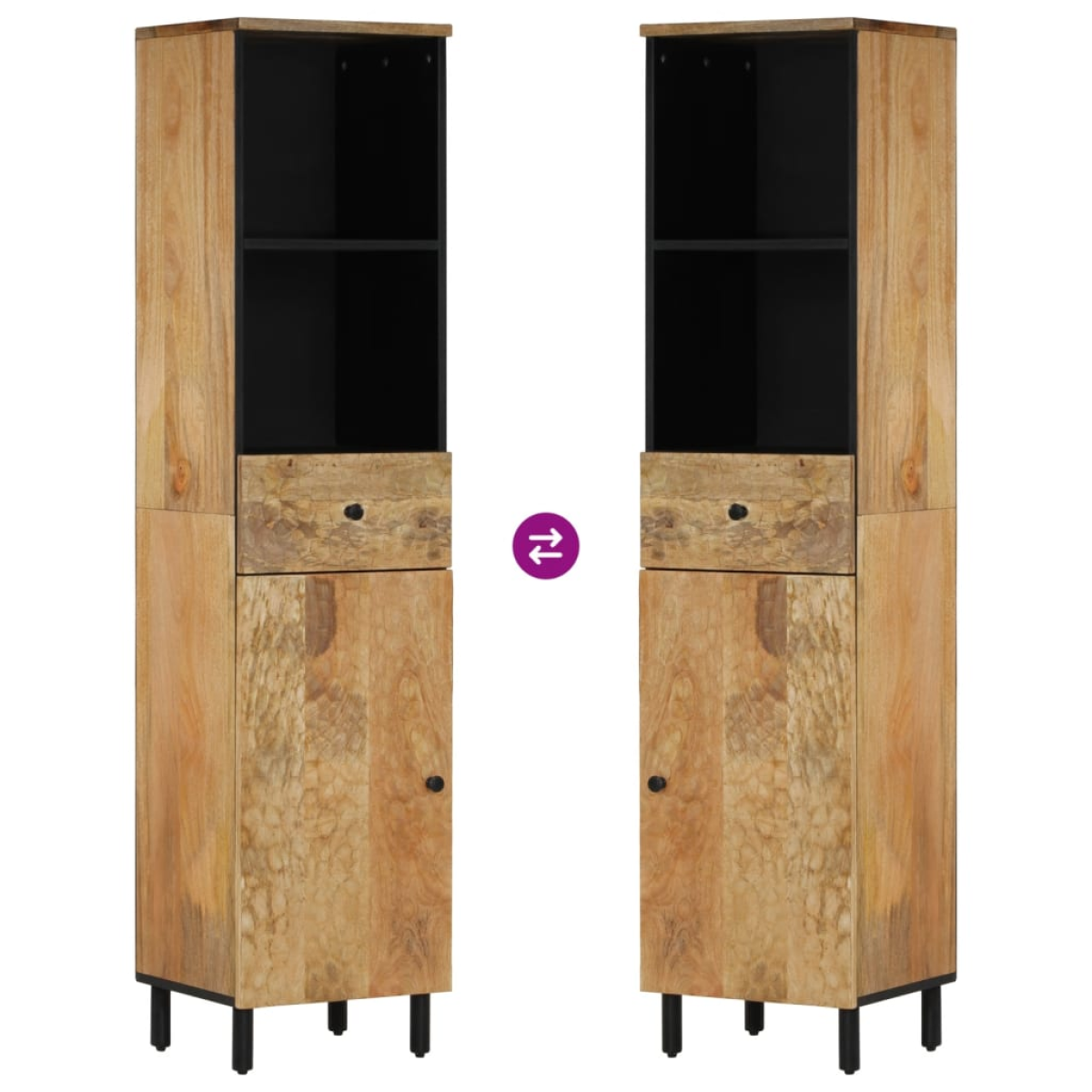 This bathroom cabinet is a great choice for your bathroom, making it tidy and organised! Solid mango wood: Solid mango wood is a strong, tropical hardwood that makes sturdy furniture. Its beautiful wood grains make every piece of furniture slightly different from the next. Made of solid mango wood, the bathroom storage cabinet is durable and stable.Ample storage space: This cabinet for bathroom offers ample storage space to keep your essentials well organised and within reach.Flexible door: You can install the door either on the left side or right side based on your own needs.Sturdy legs: The iron legs add the bathroom cupboard's sturdiness and stability. Warning:To prevent it from tipping over, this product must be used with the provided wall attachment device.
