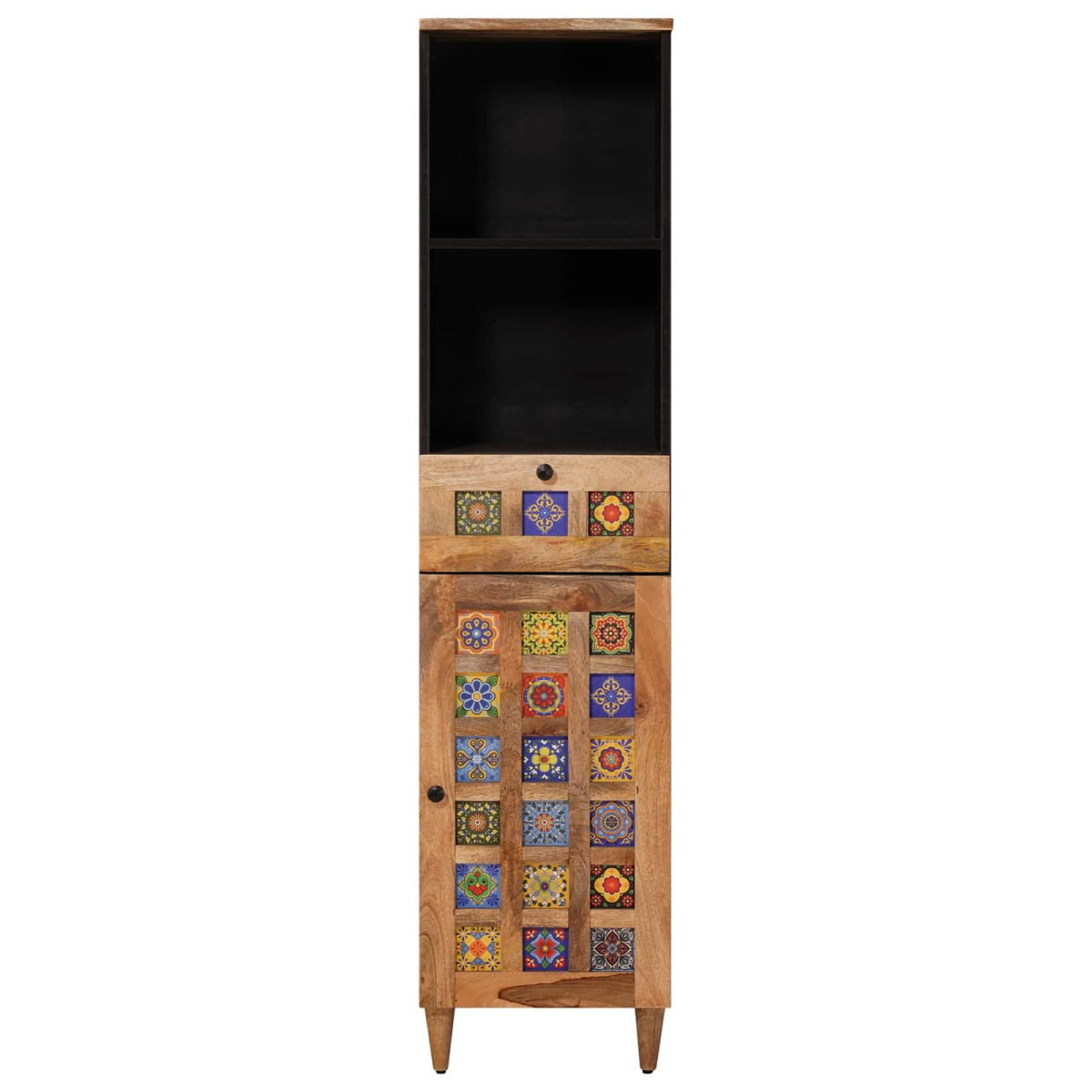 This modern bathroom cabinet exudes simplicity and functionality, making it a striking addition to any contemporary bathroom setting. Its sleek design is evident in its clean lines and minimal ornamentation, seamlessly fitting into compact spaces while enhancing the room's aesthetic. The cabinet offers versatile storage solutions, perfect for families or individuals aiming to keep their bathroom essentials neatly organized and within easy reach. Solid Mango Wood: Both the surface and doors of this bathroom cabinet are crafted from solid mango wood. This material not only provides a robust and durable structure but also adds a natural and elegant touch to the bathroom decor. Its resilience ensures the cabinet withstands daily wear and tear, offering long-term use and maintaining its stylish appearance. Functional Design: The cabinet features a rectangular shape with thoughtful dimensions of 38 x 33.5 x 160 cm, ideal for fitting into narrow bathrooms without compromising on storage capacity. It seamlessly blends fashion and practicality, allowing users to enhance their bathroom ambiance while enjoying a tidy space. Metal Legs: The cabinet stands on sturdy metal legs painted in black, providing a striking contrast to the natural wood finish. These legs ensure the unit's stability and elevate it slightly, making it easier to clean underneath and adding a modern touch to its overall design. Integration Capabilities: Designed to blend with other modern furnishings, this cabinet's minimalist approach coordinates effortlessly with existing bathroom decor. Whether paired with fresh linens or contemporary fixtures, it complements a wide array of styles, delivering both utility and aesthetics. Easy Maintenance: The cabinet is designed for indoor use and is easy to maintain. Simply wipe it down with a damp cloth to keep it clean and preserve its pristine condition. This minimal upkeep ensures a stylish look without the hassle of complicated cleaning routines, offering convenience to busy homeowners.