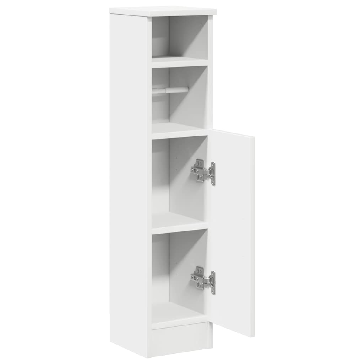 The bathroom cabinet is an ideal choice for your space, combining both style and functionality, offering ample storage to keep your toiletries and essentials neatly organised. Stable and durable material: Engineered wood is a durable and stable material with a smooth surface that is resistant to moisture, warping, and splitting, making it a reliable choice for a variety of projects.Roll holder: The bathroom storage cabinet includes a built-in paper roll holder, enhancing convenience by keeping toilet paper within easy reach and neatly organised.Ample storage space: This bath cabinet offers versatile storage options with an open shelf for easy access to frequently used items, and a closed cabinet for storing larger items like towels and cleaning supplies.Customisable installation: You can assemble the door either to the left or right side of the cabinet opening, according to your personal preferences or space requirements.Easy to maintain: Thanks to its smooth surface, the bathroom cupboard is easy to clean with a damp cloth and requires less maintenance. Warning:To prevent it from tipping over, this product must be used with the provided wall attachment device.