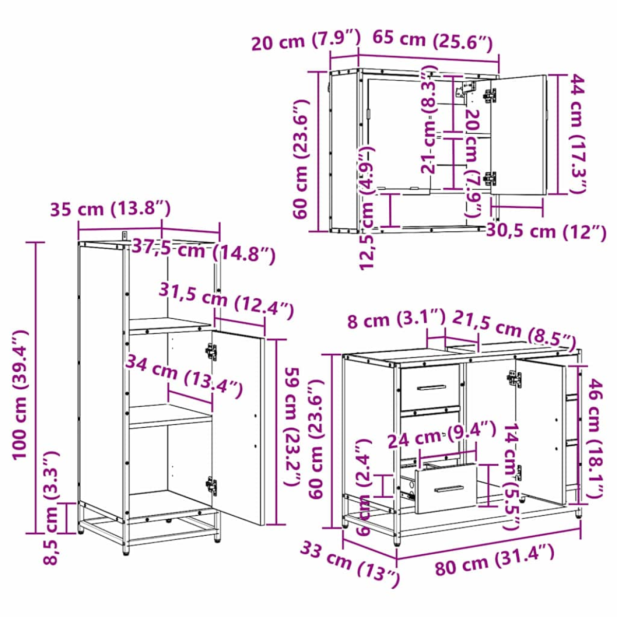 - 1 x Bathroom sink cabinet: 80 x 33 x 60 cm (LxWxH)