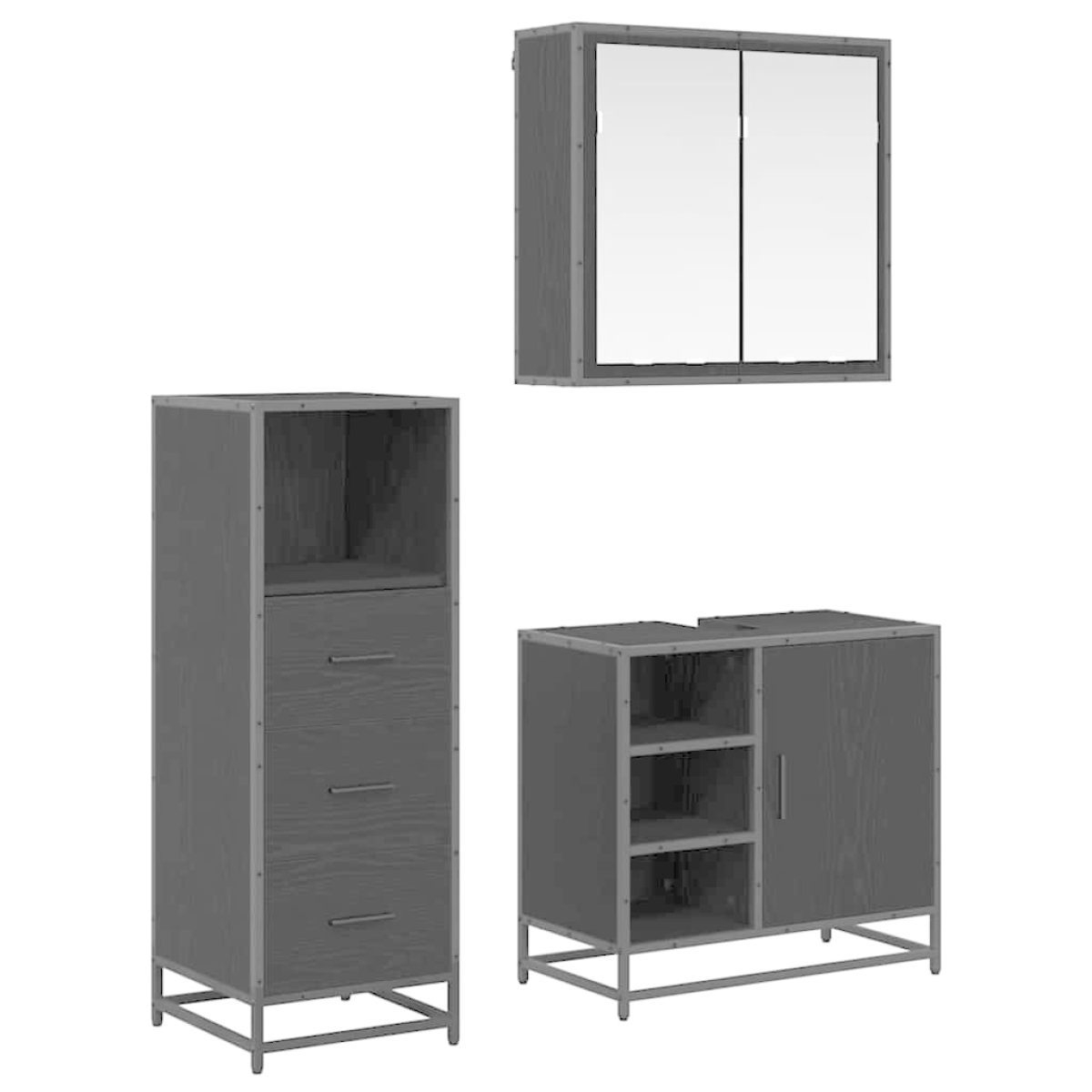This stylish Bathroom Furniture Set is a fab pick for anyone wanting to keep their bathroom neat and chic. Blending modern looks with practicality, it offers a smart storage solution. Its clean lines and soft colours make sure it fits right in with contemporary spaces while giving you the order and functionality you need in one of the busiest rooms of your home, providing both good looks and practicality. Materials: Made of engineered wood, the set boasts a sturdy and pleasing finish that suits different styles. The surface layers are tough against wear and moisture, keeping the set looking good and working well. The added metal bits help make it strong and stylish too. Included Components: The set includes a bathroom mirror cabinet, a sink cabinet, and a bathroom cabinet—each crafted for maximum practicality. The flush doors and back panels are thoughtfully put in place for a clean look. With bar handles for easy access, these parts bring both function and style to your daily routine. Features / Function / Design: Built with storage as a top priority, the handy drawers and shelves hold all your bathroom bits, turning it into an organised retreat. Its rectangular shape makes the most of the space, even in tight spots, enhancing usability without skimping on style, fitting right in with modern, minimal interiors. Recommended Uses: Perfect for any size bathroom, this furniture set does its job brilliantly, whether in a small flat or a roomy house. Its easy-going design works with various interior styles, giving you decor flexibility while creating a neat and tidy atmosphere. Care & Maintenance: Keeping it looking good is easy—just wipe the surfaces with a damp cloth to protect its shiny finish over time. Regular care helps it last longer and keeps it looking great as part of your home decor.