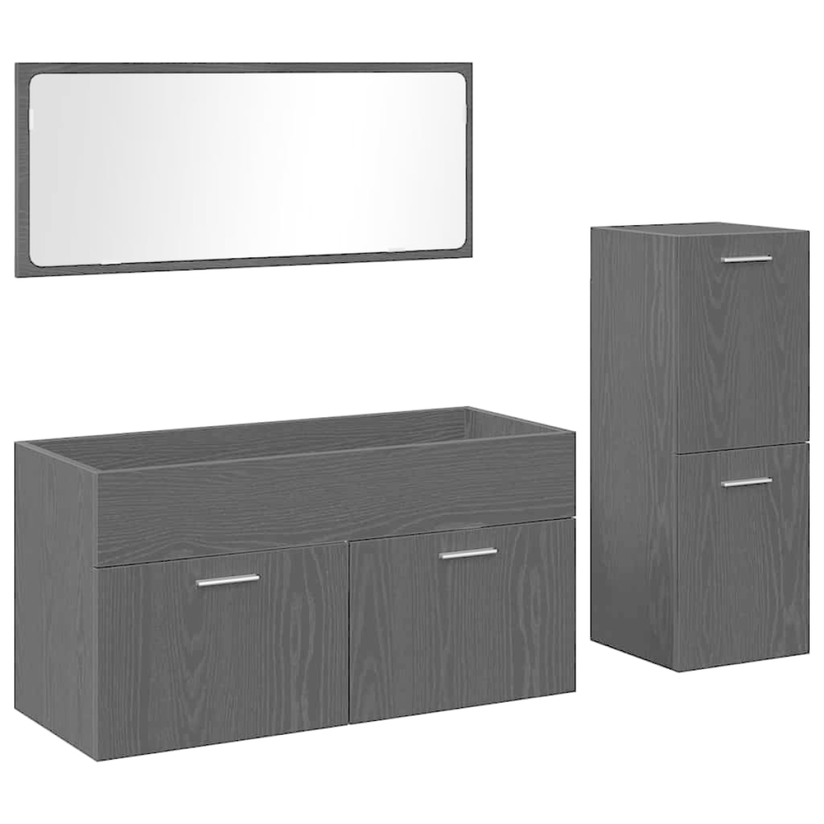 This bathroom furniture set is a stylish and functional addition to any modern bathroom. Characterized by clean lines and minimal ornamentation, it effortlessly blends form and function. The set includes a rectangular-shaped mirror, a cabinet with flush doors, and metal handles, crafted from engineered wood for durability. Materials: Crafted from premium engineered wood, this bathroom furniture set offers a robust construction suitable for indoor use. The engineered wood is chosen for its strength, appearance, and long-lasting qualities, ensuring your bathroom set retains its elegance and sturdiness, even with regular use. Included Components: The set includes a large plane mirror and a cabinet with smooth flush doors that create a seamless look. Metal bar-type handles add a modern touch while ensuring durability and easy access to storage spaces. This combination of components fosters functionality and style in your bathroom. Features /Function /Design: With its modern aesthetic, this bathroom set prioritizes simplicity and functionality. The wall-mounted design saves space and enhances the streamlined look of your bathroom. This thoughtful design also promotes efficient use of available space, making your bathroom both elegant and practical. Care &Maintenance: To maintain the refined appearance of this furniture set, simply wipe with a damp cloth to remove any dust or stains. This straightforward care ensures that your furniture remains inviting and pristine for years, without the need for complex maintenance. Recommended Uses: Ideal for contemporary bathrooms that require stylish and space-efficient furniture. This set offers a sleek and functional solution for those looking to enhance their modern interiors with simplicity and elegance.