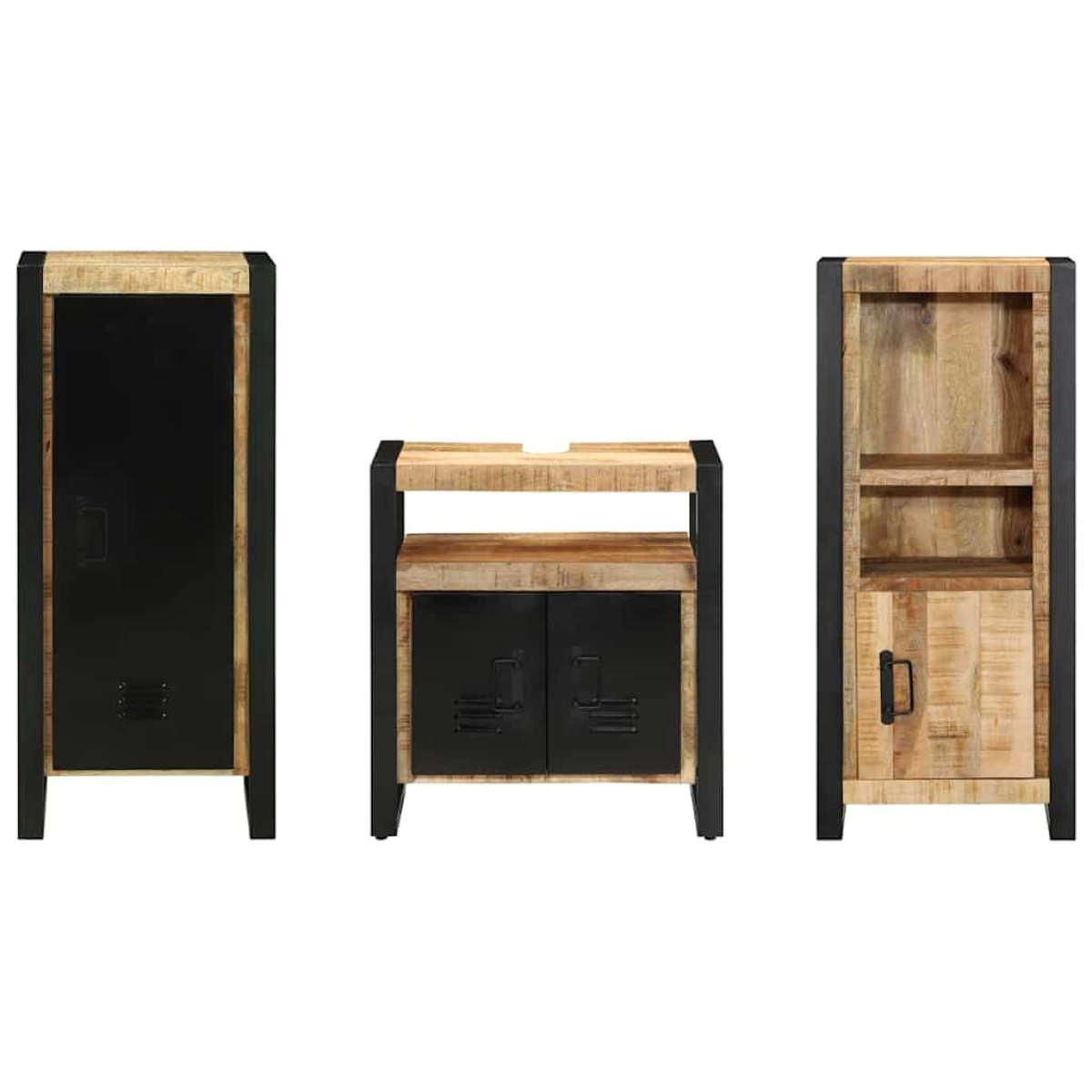 This modern bathroom furniture set breathes elegance into your bathroom space with its sleek design and minimalistic appeal. Characterized by clean lines and a clutter-free aesthetic, it fits beautifully in contemporary settings. This set, designed for indoor use, comprises strategically sized cabinets ideal for bathrooms featuring unique spatial designs, bringing both functionality and style to your personal sanctuary. Materials: The furniture set utilizes a hearty blend of modern materials, featuring metal frames that lend an industrial flair, merged with solid wood doors for an appealing contrast. This combination not only enhances the overall durability but maintains a lightweight setup for ease of installation and positioning as a wall-mounted ensemble in urban apartments or compact interiors. Embracing these materials, the set stands resilient against everyday wear and tear, ensuring lasting beauty and performance. Included Components: This furniture set includes three cornerstone components: a sink cabinet, a floor-standing cabinet, and a wall-mounted cabinet. The sink cabinet facilitates optimal storage under your basin, the floor-standing cabinet maximizes vertical storage ideal for compact bathroom spaces, and the wall-mounted unit enhances space utilization without crowding the floor. Each component contributes seamlessly to creating a harmonious and organized environment, affording ample storage opportunity for toiletries and essentials. Features /Function /Design: The space-efficient and wall-mounted nature of this set makes it a boon for apartment living and small home bathrooms, allowing freedom of floor space. The design encourages natural space flow and unobstructed access to bathroom necessities, ensuring everyday functions remain undisturbed. Its modern look adapats to various interior styles, adding value without compromising on utility or visual appeal. Recommended Uses: Perfectly suited for urban apartments, minimalist homes, and contemporary design enthusiasts, this set serves those mindful of space without compromising style. Ideal for revamping existing decor with a modern flair while offering practical storage solutions. Whether for newly established residential properties or refurbishing existing bathroom spaces, it caters to diverse needs and decor preferences, offering flexibility and charm. Care &Maintenance: Maintenance couldn't be simpler: by utilizing a dry cloth for cleaning dust and other residues, you'll maintain the pristine appearance of the furniture set effortlessly. Avoid using harsh chemicals or cleaning agents that may cause surface damage. The sensible care routine saves time while ensuring your bathroom furniture set remains visually striking throughout its long lifespan.