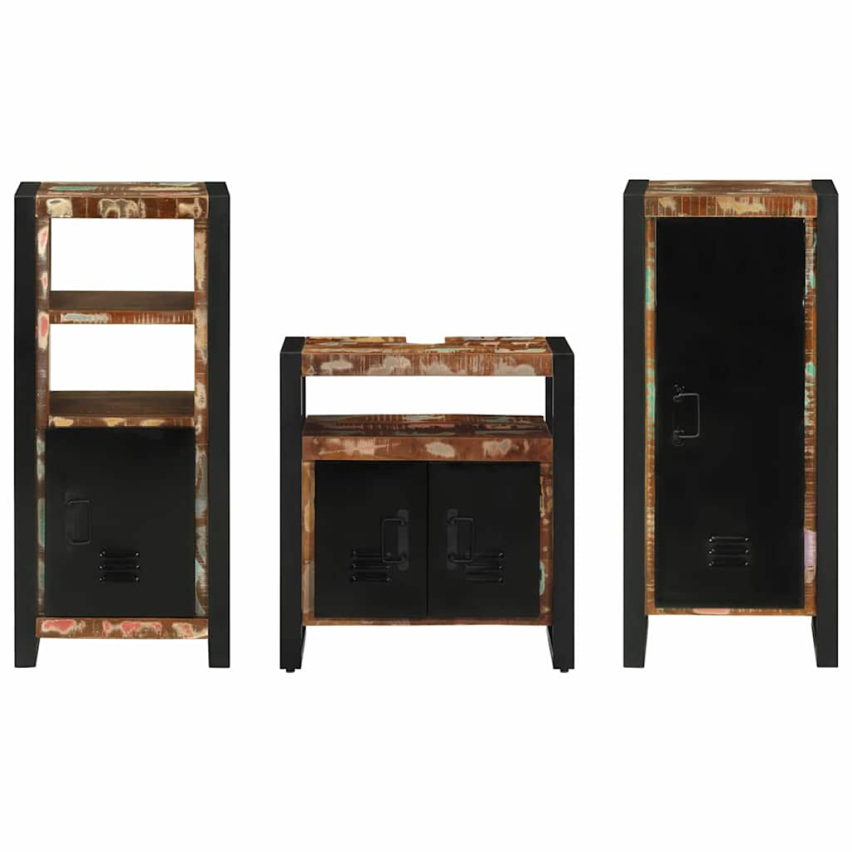 This bathroom cabinet set is designed to add a cool yet rugged vibe to any space, combining useful storage with a modern look. The set has three versatile cabinets, each with its own unique touches that boost both style and functionality. With its sturdy iron legs and textured surface, these cabinets are great for urban lofts or contemporary homes, adding a hint of industrial charm. They make a fantastic centrepiece, offering practicality alongside a dash of sophistication. Materials: With a textured finish, these cabinets mix function with style, perfect for modern interiors. The iron legs are solid support, and the doors made from solid wood ensure they last, even with everyday use. Included Components: The set has two floor cabinets and one wall-mounted cabinet, all featuring solid wood doors for privacy and style. The wall unit saves space, perfect for tight spots. Features / Function / Design: These cabinets have multiple storage areas, giving you plenty of room to sort out your bathroom bits efficiently. Their sleek, industrial look works well with urban decor or loft-style living, turning utility into a style statement. Recommended Uses: Great for urban flats or anyone looking to bring industrial vibes into their spaces, these cabinets fit well in bathrooms, living rooms, or even hallways. Their flexibility is good for homes and works well in commercial areas, too. Care & Maintenance: Super easy to keep clean; just a dry wipe will keep them looking fresh. A bit of regular care helps them stay appealing long-term without harming the surface.