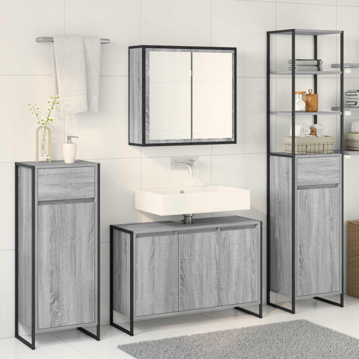 This bathroom furniture set exemplifies modern elegance, gracefully combining function and style. Ideal for urban living spaces, it offers an efficient storage solution that caters to contemporary needs with its smooth design and sleek appearance. The fusion of engineered wood with steel enhances its robustness, serving as a both practical and aesthetic addition to bathroom interiors. Premium Materials: Crafted using durable engineered wood complemented by a strong steel frame, this furniture set ensures longevity. These materials resist common bathroom moisture, keeping your set pristine and appealing. Engineered wood offers stability for heavy loads while its fine grain provides a naturally polished touch. Versatile Utility: Designed with board shelves that can accommodate various bathroom essentials, you're ensured ample space. The planed mirror elevates the décor while providing practical functionality essential for personal grooming. Design Meets Function: Adorned in a restrained modern style, this set fits effortlessly into any bathroom. It reduces clutter through efficient organization while its smooth lines offer aesthetic allure and functionality, embodying the minimalist ethos. Effortless Setup: The wall-mounted installation option saves crucial floor space and adds a streamlined look. This feature is bolstered by engineered wood components, handling weight without sacrificing integrity. Simple Care: Maintaining the furniture's grace is straightforward—simply wipe down with a damp cloth to preserve its sheen. Avoid retrogressive chemicals, ensuring the finish remains immaculate year-round.