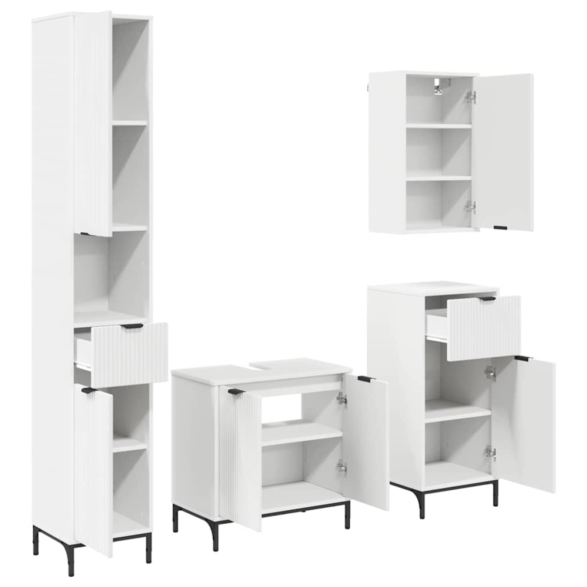 This elegant Engineered Wood Bathroom Furniture Set enhances any bathroom space with modern design efficiency and high functionality. Crafted for those who value streamlined style and practical storage solutions, this furniture set offers a balanced mix of aesthetic simplicity and adaptability for diverse spaces. Its minimalistic form and versatile storage options make it the perfect solution for any-sized bathroom, seamlessly integrating with a variety of interior designs. Materials: Thoughtfully constructed from engineered wood, this set balances stability and style, bringing a sleek design to the forefront. Engineered wood is chosen for its uniform surface, moisture resistance, and durability, providing a refined look that enhances the overall bathroom environment while simplifying care routines. Included Components: The set delivers comprehensive storage solutions with a wall-mounted sink cabinet, bathroom cabinet, bathroom wall cabinet, and a high cabinet. Each component delivers user-friendly access, enhancing bathroom organization and space management. Features /Function /Design: Designed for modern aesthetics, the flush doors with smooth surfaces and bar handles deliver a refined, seamless appearance. Each piece lends a clean, cohesive look to any bathroom space, supporting a tidy and organized environment. Recommended Uses: Perfect for maximizing bathroom efficiency, this furniture set supports varied storage needs with convenient partitioning, making it an ideal choice for small apartments, family homes, or guest bathrooms. Its sleek design integrates effortlessly into any modern décor. Care &Maintenance: Maintenance is stress-free. To retain its clean, finished look, simply wipe surfaces with a damp cloth regularly. The engineered wood construction ensures longevity through simple, minimalistic care.
