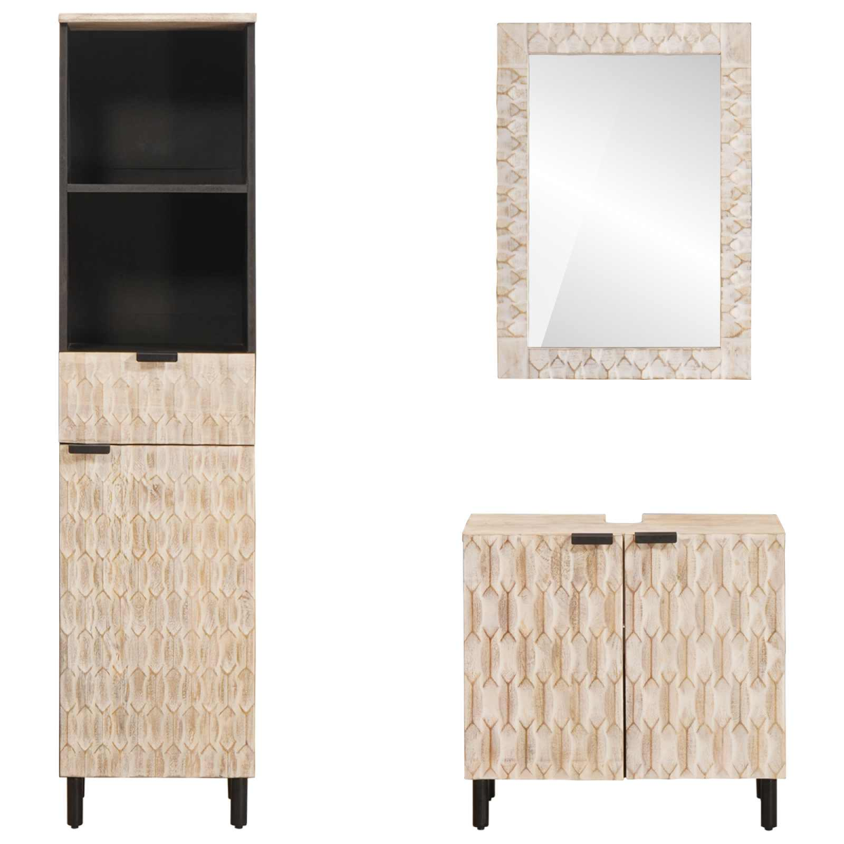 This beautifully crafted bathroom set is the epitome of modern design, blending function and simplicity to transform any bathroom space into a sanctuary. Its minimalist approach is evident in the clean lines and lack of ornamentation, making it ideal for those who appreciate an uncluttered bathroom environment. The set includes essential items such as a bathroom sink cabinet, a bathroom mirror, and an additional cabinet, providing both style and function in perfect harmony. Solid Mango Wood: The bathroom set is meticulously crafted from solid mango wood, known for its robustness and natural grain patterns. This material ensures longevity and brings a warm, rich texture to your space, enhancing the visual appeal of the bathroom. Modular Components: Designed with user versatility in mind, the set includes individual pieces: a sink cabinet, mirror, and bathroom cabinet. This modular layout allows you to customize the arrangement to fit your space and aesthetic, making the ensemble both adaptable and personal. Stylish Simplicity: Featuring a modern aesthetic characterized by its clean lines and minimal ornamentation, this set embraces simplicity as the ultimate sophistication. The neutral tone complements various bathroom styles, providing a timeless elegance. Functional Design: Every element of the set is designed for ease of use and practicality. The cabinets provide ample storage for bathroom essentials, while the mirror enhances the perception of space, completing the functional trifecta necessary for a streamlined bathroom experience. Easy Care: Maintenance is straightforward with this modern bathroom set. Each piece can be effortlessly cleaned using a damp cloth, ensuring that your bathroom maintains its pristine appearance with minimal effort.