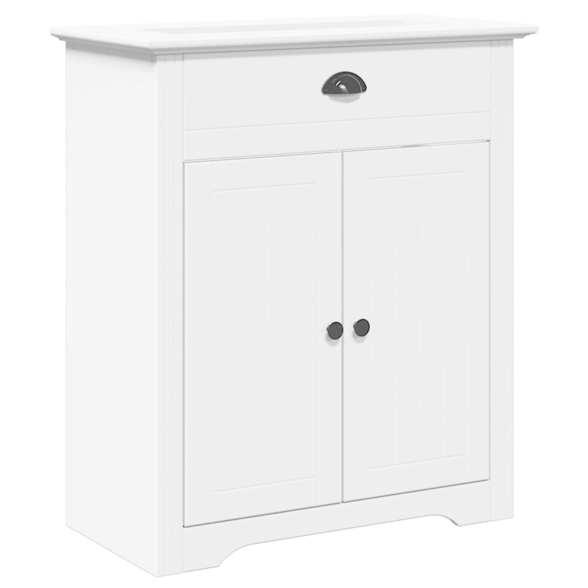 This bathroom sink cabinet is meant to be a great addition to your bathroom, giving it a retro and elegant appearance! Durable material: Solid pinewood is known for its strength and durability. Its straight grains and distinctive knots contribute to its rustic charm. Engineered wood is a durable and stable material with a smooth surface that is resistant to moisture, warping, and splitting, making it a reliable choice for a variety of projects.Ample storage space: This bathroom furniture offers ample storage space to keep your essentials well organised and within reach.Easy to use: The metal handles of the doors make it convenient to open and close and make the sink cabinet more attractive.Easy to maintain: Thanks to its smooth surface, the bathroom sink cupboard is easy to clean and only needs a wipe with a dry cloth. Good to know:Screws and plugs for inside the wall are not included. We advise to find and use screws and plugs suitable specifically for your walls. If you're not sure, you can consult with a professional. Please read and follow each step of the instructions. Warning:To prevent it from tipping over, this product must be used with the provided wall attachment device.