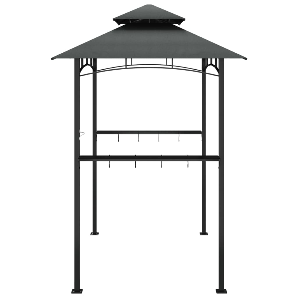 Do you want to enjoy a comfortable barbecue with your family and friends on a hot summer day or a rainy day? This BBQ gazebo is just what you need! Steel frame: Steel is an exceptionally hard and strong material. It offers sturdiness and stability.Durable roof: The polyester roof with PA coating is water resistant, making this outdoor bbq shelter suitable for outdoor use. Great ventilation: The double-tiered barbecue gazebo is designed for great air circulation and ensures stability in windy conditions.Practical design: Equipped with a practical light hook, you can hang the lights to enjoy your barbecue party during the day or at night, and the integrated bottle opener meets the need to quickly open beer and drinks and enjoy the party to the fullest.Convenient shelves and hooks: This bbq canopy has 2 side shelves to provide space for your food and drinks, and the hanging bars can be used to hang barbecue tools. Good to know:To make assembly as easy as possible, each product is delivered with a manual.
