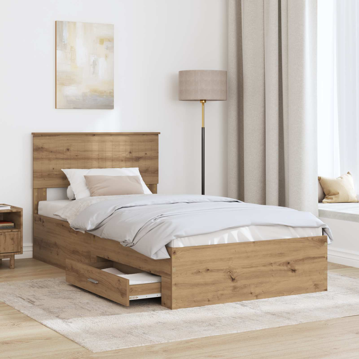 This Modern Storage Bed Frame offers a fresh take on bedroom furnishings, combining style and functionality seamlessly. The sleek design features a minimalist rectangular shape that complements modern décor, making it a versatile addition to any bedroom setup. The clean lines and simple elegance of the bed frame allow it to blend effortlessly into a variety of styles, offering a sophisticated centerpiece for relaxation. Engineered Wood Construction Crafted from high-quality engineered wood, the bed frame offers durability and stability, ensuring long-lasting use. The material is chosen for its reliability and resistance to wear, making it a practical choice for everyday use. It combines style with functionality seamlessly, maintaining its aesthetic appeal over time. Built-In Storage Solutions The bed frame includes convenient storage space, ideal for keeping linens, clothes, or personal items neatly organized under the bed. This feature maximizes bedroom storage without compromising on space, making it perfect for smaller rooms or apartments where additional storage is at a premium. Modern Headboard The included headboard, constructed of engineered wood, complements the bed frame's design, adding a touch of elegance and a finished look. It provides support whether you're sitting up to read or lying down to rest, enhancing the bed's comfort and functionality. Efficient Design Measuring 32 cm in bed height, this design is easy to assemble and clean, featuring a user-friendly setup with minimal requirements. Assembly involves two people and requires only a screwdriver, making it straightforward and time-efficient to put together. Easy Maintenance Maintaining the bed frame is simple thanks to the wipe-clean engineered wood surface. Just a damp cloth is needed to keep it looking fresh and spotless, ensuring that the bed frame is as functional as it is stylish.
