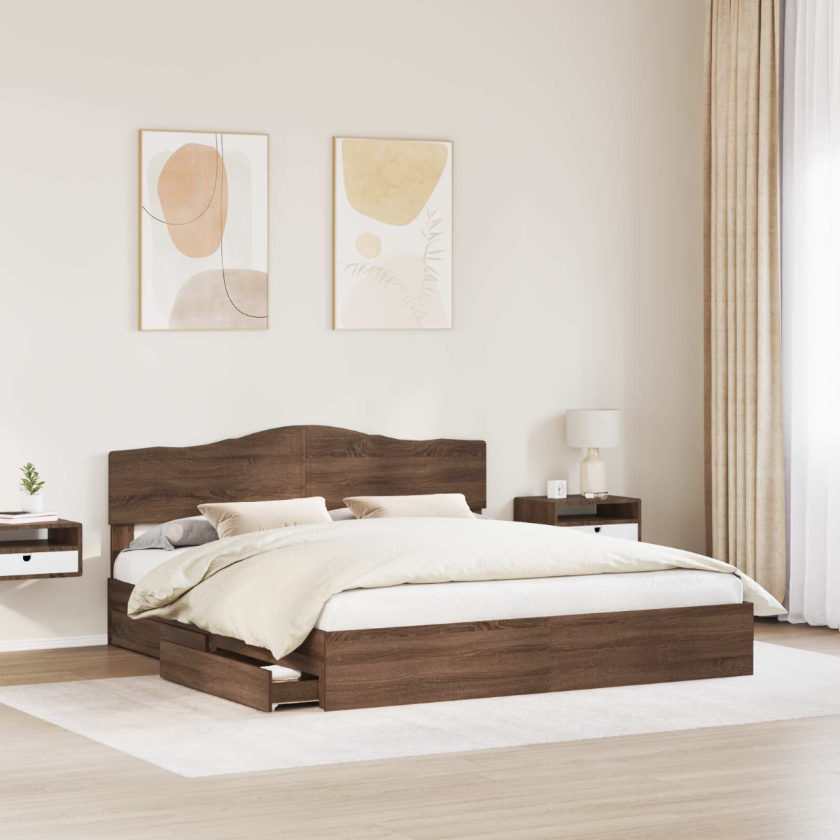 This platform bed frame seamlessly merges functionality with modern design, offering a stylish centerpiece for any bedroom. The rectangular shape paired with clean lines lends the bed a sleek, minimalist appearance, perfect for those who appreciate understated elegance. Designed for indoor use, this bed supports a clutter-free aesthetic while providing practical features for your needs. Its engineered wood construction imbues it with a solid presence, ensuring it remains a stalwart part of your bedroom setup. Engineered Wood Frame crafted with attention to detail, this frame offers durable construction that stands up to daily use. The material is chosen for its strength and reliability, providing a stable structure for rest and relaxation. Platform Slatted Base A solid or closely spaced slatted frame design lends ample support to your mattress, eliminating the need for a box spring and ensuring an even sleep surface. Integrated Storage Drawers conveniently located beneath the bed, allowing for practical storage solutions. The traditional handle design ensures easy access and functionality, seamlessly blending convenience with style. Modern Aesthetic characterized by its sleek, minimalist design, the bed complements contemporary interiors, offering a straightforward yet impactful look to your bedroom. Simple Care &Assembly Easy to maintain with a simple wipeable surface that requires minimal upkeep. Assembly is straightforward, requiring two people and a screwdriver, making setup manageable and efficient.