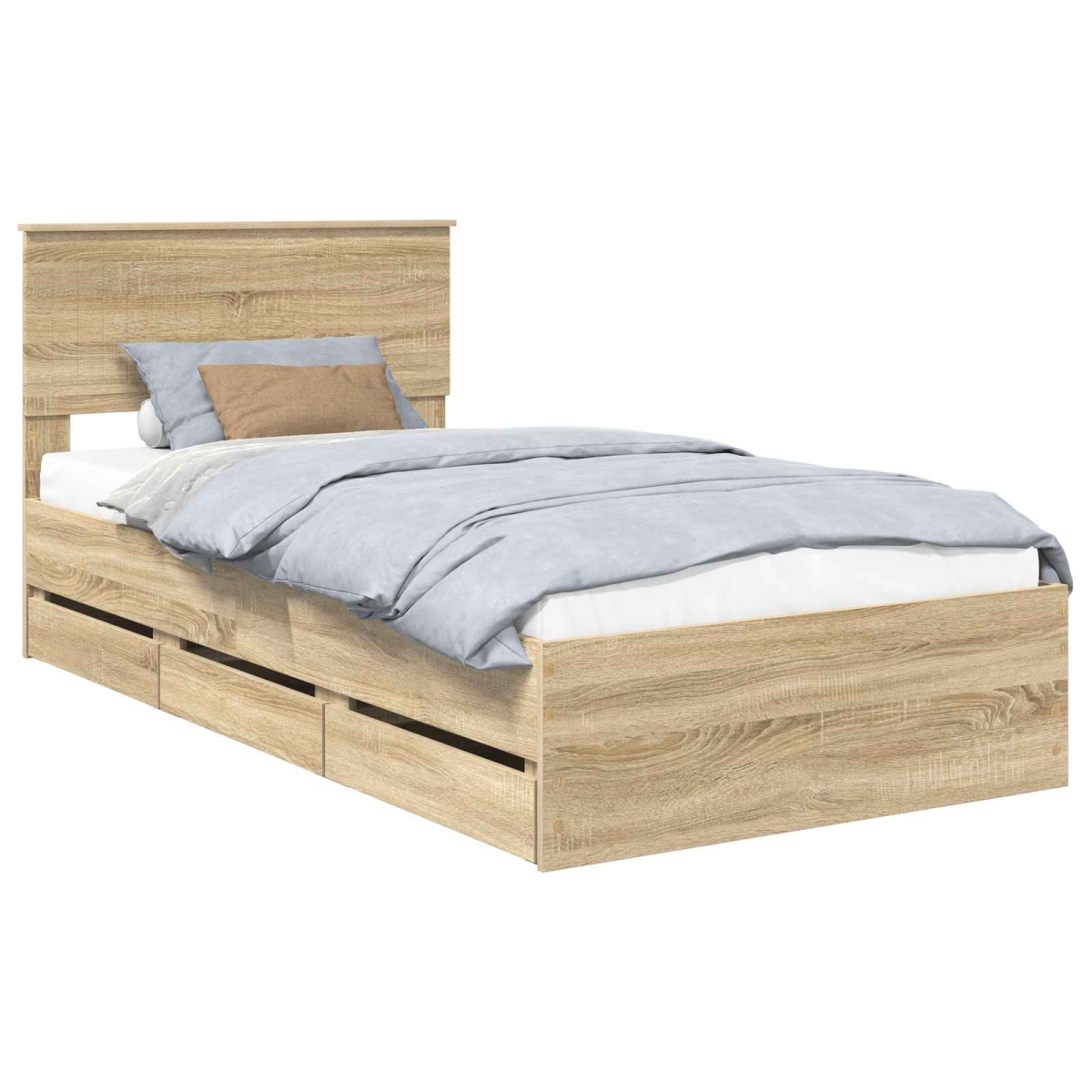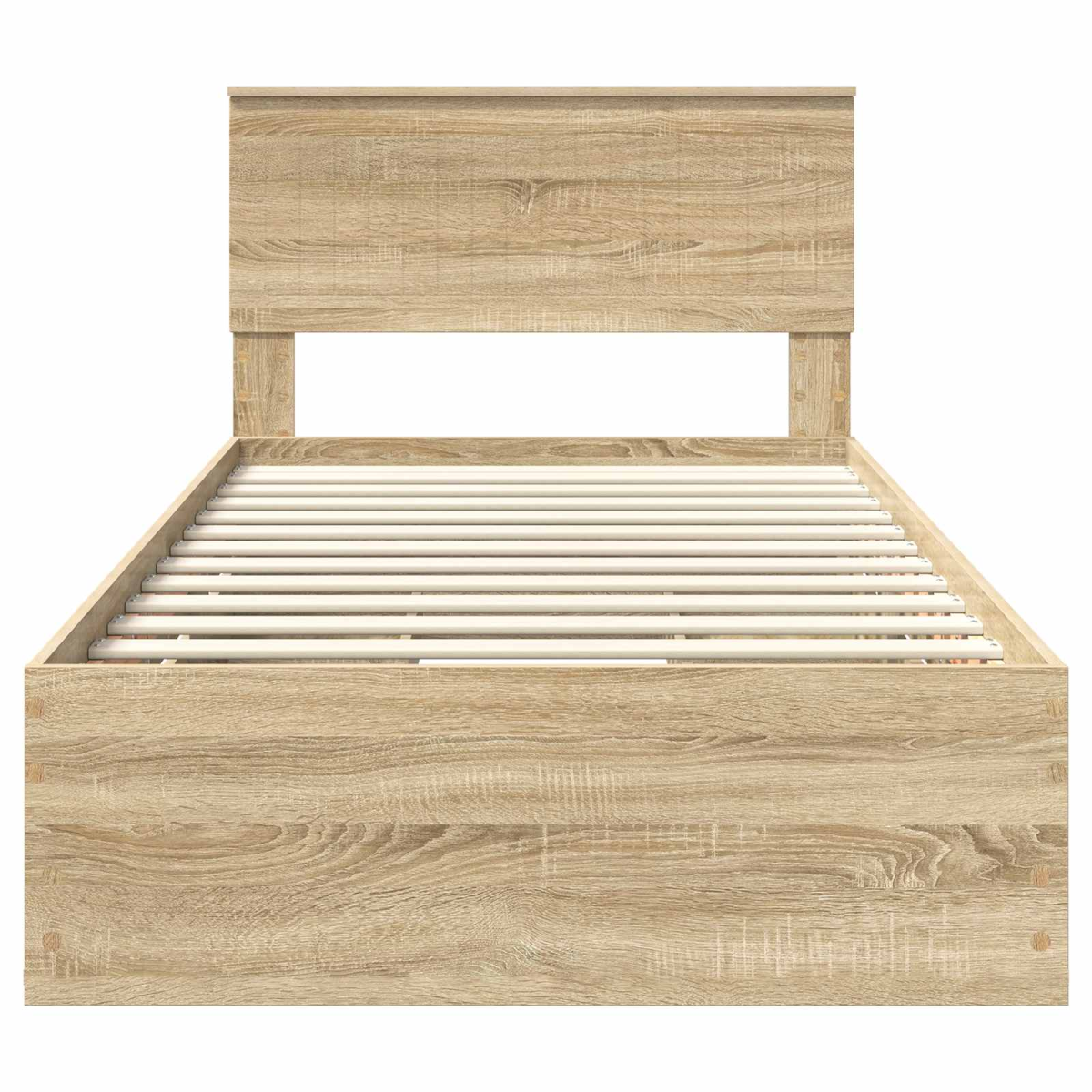 This modern Bed Frame elegantly combines simplicity with functionality, making it a timeless addition to any bedroom. It invites with its clean lines and minimal ornamentation, providing a versatile aesthetic that is ready to complement various style preferences. Ideal for those desiring a fresh and contemporary look, this bed frame serves as a canvas for creative bedding choices, whether bold or subtle. Engineered Wood Craftsmanship : Our bed frame features engineered wood construction that ensures strength and resilience, perfectly resisting wear and tear even in high-use environments. This material promotes lasting style and beauty, providing a reliable foundation for good sleep. Discreet Storage Solutions : It includes hidden drawers ingeniously designed to organize room essentials and keep the space clutter-free. These compartments offer a seamless solution for those who value both aesthetic and practicality, enhancing the overall functionality of the bed frame. Simplicity in Slatted Frame : The frame incorporates a fixed slatted design with wooden slats for reliable support. This provides an excellent base for mattresses, promoting airflow beneath the mattress and ensuring a fresher sleeping experience. Designed for Stability : The square legs provide solid, unwavering support. The contemporary design of the legs complements the minimalist nature of the piece, enhancing stability without sacrificing style. Easy Care : Simply wipe clean with a damp cloth to maintain its pristine condition. This functional piece ensures that care and maintenance are straightforward, preserving its elegance over time.