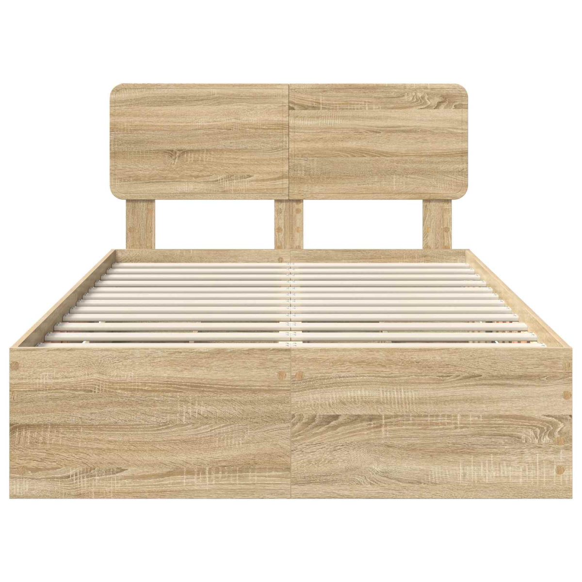 This modern bed frame is a sleek, stylish addition to any bedroom setting. Constructed with simplicity and functionality in mind, it seamlessly blends into contemporary environments, providing a clean, clutter-free aesthetic. With its geometric silhouette and minimalist appeal, the bed frame offers a sophisticated backdrop to your room's decor while providing practical support for a restful night's sleep. Engineered Wood Durability The bed frame is crafted from high-quality engineered wood, known for its resistance to abrasion and everyday wear and tear. This ensures that the bed maintains its sleek appearance and sturdiness over time, providing a reliable platform for your mattress and peace of mind for the user. Fixed Slatted Frame The fixed slatted frame offers a solid support system for your mattress, promoting good ventilation and extending the lifespan of your bedding. The rigid slats provide consistent stability, ensuring a comfortable night's sleep without the need for constant adjustments. Discreet Storage Solutions Hidden within the frame is a secret compartment drawer that provides additional storage space. Ideal for keeping personal items or bedding tucked away, this feature highlights the bed's multifunctional attributes, allowing for a clutter-free room. Engineered Wood Headboard The headboard is meticulously crafted from engineered wood, adding both aesthetic appeal and functionality. It serves as a stable backrest while also enhancing the modern styling of the bed. The warmth and texture of the wood make it a cozy addition to the bedroom ambiance. Effortless Cleaning and Care Maintenance of the bed frame is straightforward: simply wipe down with a damp cloth to keep it looking pristine. This minimal care routine keeps your bed looking new with ease, making it a convenient choice for busy lifestyles.