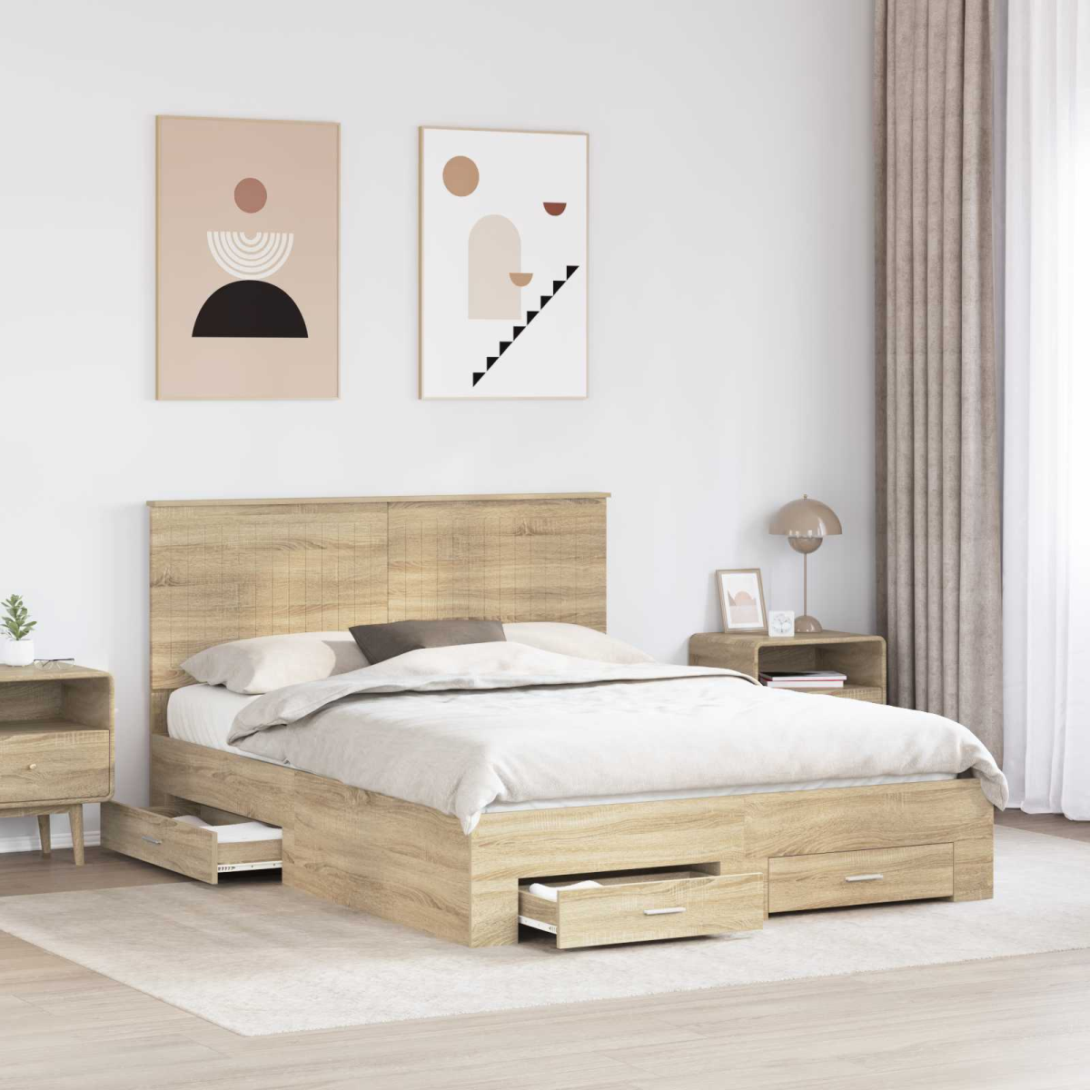 This Modern Storage Bed Frame is designed to effortlessly blend into contemporary bedrooms while enhancing functionality and style. With clean lines and a rectangular shape, it offers an inviting and organized atmosphere to any room. Its minimalistic design accentuates the sleek and practical use of space, making it ideal for urban living environments where space is at a premium. The bed frame's understated elegance ensures it pairs well with almost any interior palette, offering a unified, stylish focal point for relaxation and sleep. Engineered Wood: Crafted from high-quality engineered wood, this bed frame couples a sleek look with robust performance. The material is chosen for its ability to maintain stability and appearance, even under constant use. Its inherent resilience makes it a reliable choice for those seeking a modern yet durable addition to their sleeping space, seamlessly supporting restful nights and busy days alike. Components: This bed includes a multifunctional headboard and spacious drawers, both made from engineered wood. The fixed slatted frame offers substantial support while maintaining a compact form factor, presenting a seamless aesthetic in any room. Each component works cohesively to provide perfect balance and structure, creating a harmonious sleeping environment that is both visually appealing and functional. Functional Design: Designed with user convenience in mind, the bed frame features traditional drawer mechanisms for easy access to stored items. Its silver-colored bar handles add a touch of sophistication and practicality to the drawers, allowing users to efficiently organize personal belongings while maintaining the room’s sleek appearance. Versatile Usage: Ideal for urban apartments, houses, or any bedroom setting, this bed frame optimizes under-bed space with its ample storage capabilities. It caters to different sleeping needs, making it a versatile choice for singles, couples, or families desiring organized living conditions without compromising on style. Care Instructions: Maintaining the bed frame's fresh appearance is straightforward; simply wipe with a damp cloth regularly to preserve its pristine look. This simple care ensures the bed remains a focal point of elegance and functionality in any bedroom for years.