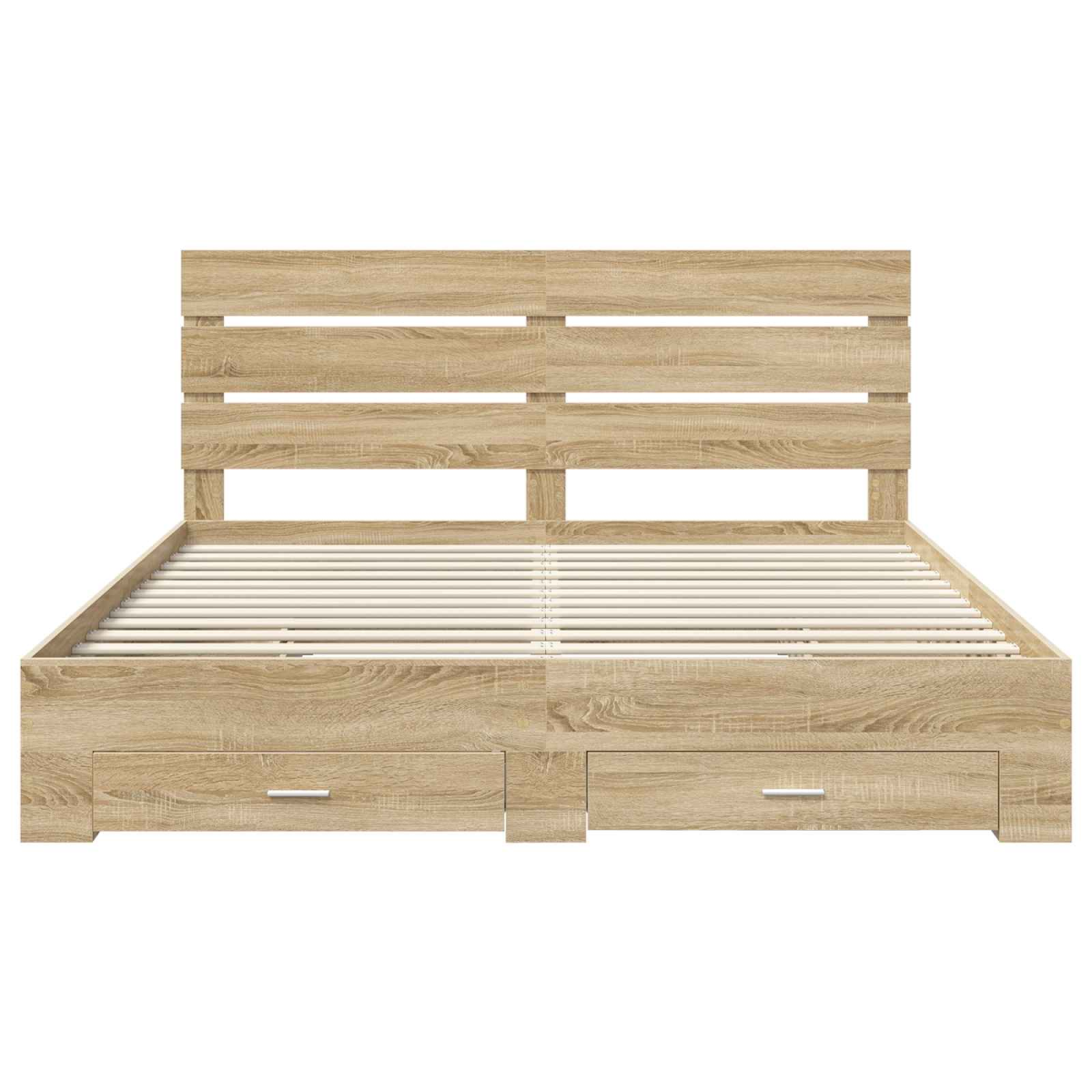 This Modern Storage Bed Frame transforms your bedroom into a sleek and organized sanctuary. Designed for those who appreciate clean lines and seamless functionality, this bed frame enhances the aesthetic of contemporary living spaces. Ideal for urban apartments or minimalist homes, its rectangular shape provides a sophisticated yet cozy charm. The fusion of style and practicality will allow you to appreciate restful nights and uncluttered days. Engineered Wood Frame Constructed with high-quality engineered wood, this durable frame withstands daily use while maintaining its pristine appeal. Engineered wood is selected for its resistance to wear and tear, offering a sleek, modern look that complements existing decor. Included Storage Drawers Built-in storage drawers provide practical solutions for space-constrained bedrooms. These traditional drawers easily open with silver-colored bar handles, perfect for storing clothes, bedding, and other personal items. Sleek Modern Design The bed frame features a modern aesthetic characterized by clean lines and minimal ornamentation. This design approach creates a sense of openness and refinement, ideal for adding sophistication to any bedroom. Functional Headboard The finished headboard, crafted from sturdy engineered wood, offers comfort and support when sitting up in bed. Its presence enhances the room's overall decor and adds an element of luxury. Simple Maintenance Easy-care features include a smooth surface that only requires wiping with a damp cloth. Maintaining the bed's fresh and clean look requires minimal effort, ensuring it remains a centerpiece for years to come.