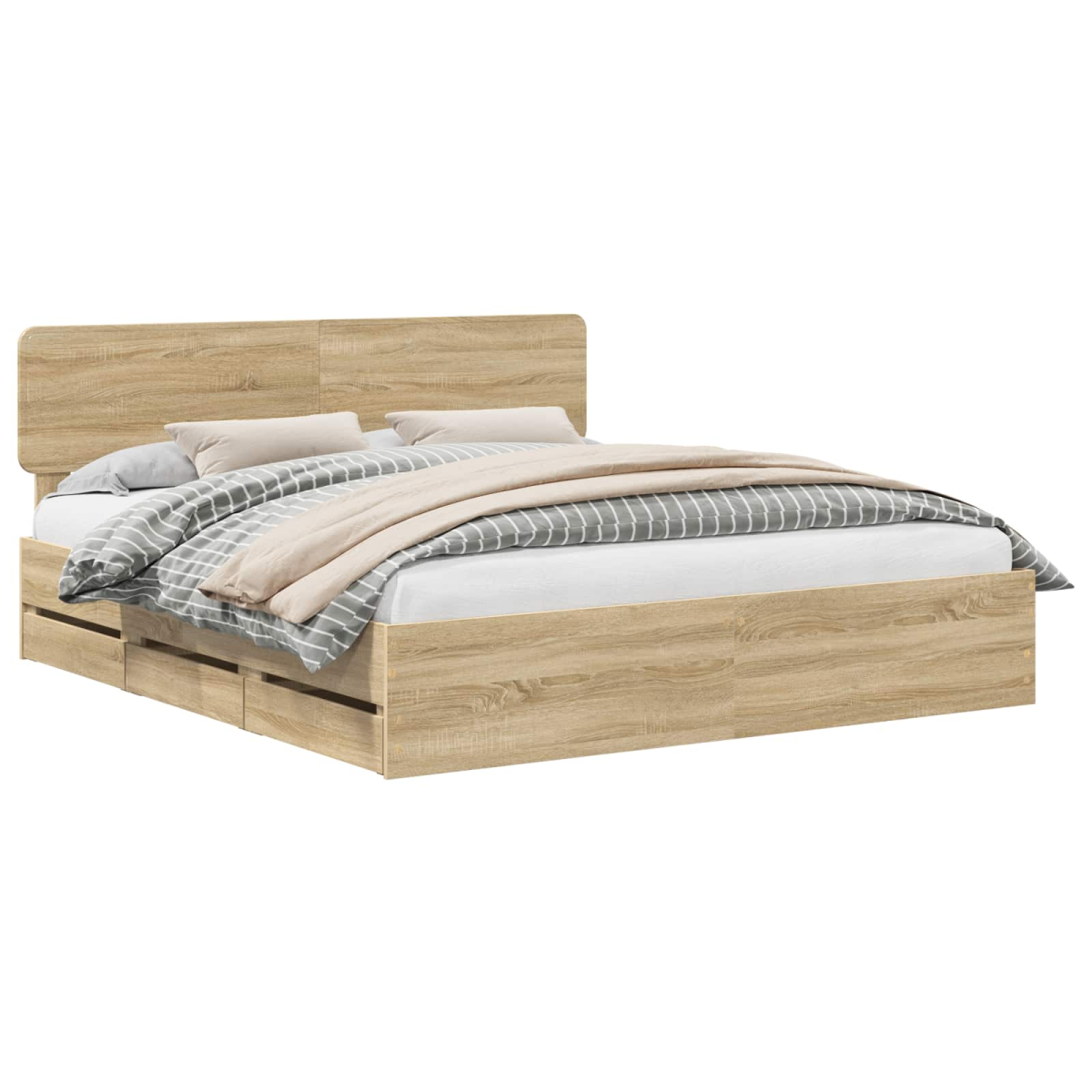 This modern bed frame is a sleek, stylish addition to any bedroom setting. Constructed with simplicity and functionality in mind, it seamlessly blends into contemporary environments, providing a clean, clutter-free aesthetic. With its geometric silhouette and minimalist appeal, the bed frame offers a sophisticated backdrop to your room's decor while providing practical support for a restful night's sleep. Engineered Wood Durability The bed frame is crafted from high-quality engineered wood, known for its resistance to abrasion and everyday wear and tear. This ensures that the bed maintains its sleek appearance and sturdiness over time, providing a reliable platform for your mattress and peace of mind for the user. Fixed Slatted Frame The fixed slatted frame offers a solid support system for your mattress, promoting good ventilation and extending the lifespan of your bedding. The rigid slats provide consistent stability, ensuring a comfortable night's sleep without the need for constant adjustments. Discreet Storage Solutions Hidden within the frame is a secret compartment drawer that provides additional storage space. Ideal for keeping personal items or bedding tucked away, this feature highlights the bed's multifunctional attributes, allowing for a clutter-free room. Engineered Wood Headboard The headboard is meticulously crafted from engineered wood, adding both aesthetic appeal and functionality. It serves as a stable backrest while also enhancing the modern styling of the bed. The warmth and texture of the wood make it a cozy addition to the bedroom ambiance. Effortless Cleaning and Care Maintenance of the bed frame is straightforward: simply wipe down with a damp cloth to keep it looking pristine. This minimal care routine keeps your bed looking new with ease, making it a convenient choice for busy lifestyles.