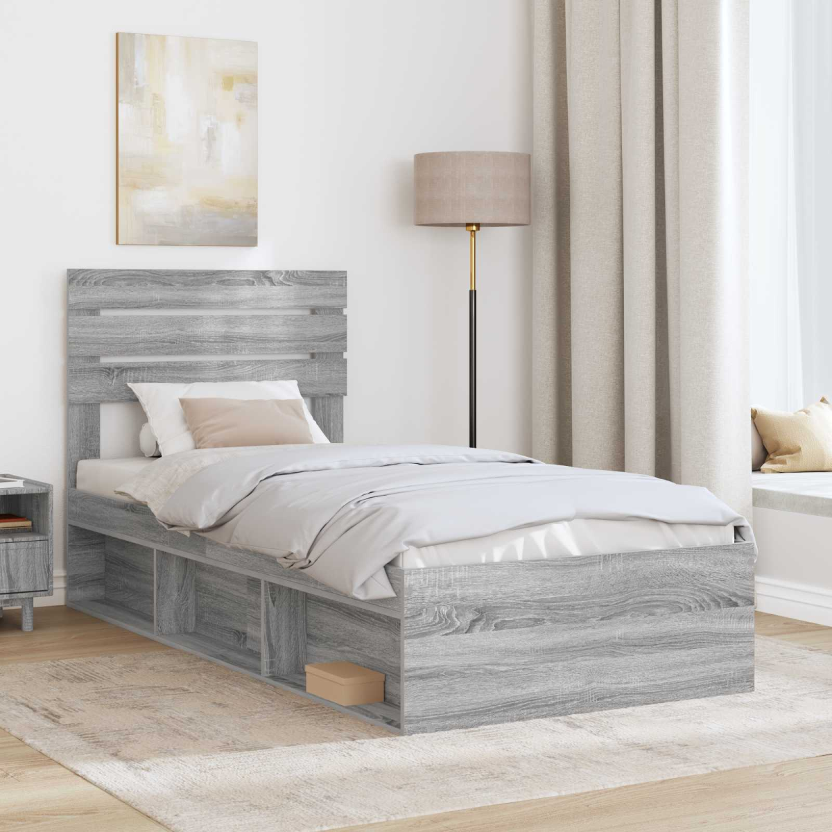 This modern bed frame blends simplistic design with functional style, offering a crisp and uncluttered addition to any bedroom. Its modern appearance with clean lines makes it an appealing choice for those seeking a minimalistic touch to their sleeping space. A well-crafted frame supports the mattress, enhancing its durability and providing a sturdy base for restful sleep. Whether for a master bedroom or guest room, this bed frame brings elegance and practicality to any setting. Engineered &Pine Wood Frame The bed frame is constructed from a combination of engineered wood and solid pine, providing a robust and reliable structure. The engineered wood offers a high level of stability, while the pine wood adds a touch of natural beauty. This combination ensures long-lasting use and a stylish look that enhances your bedroom décor. The use of quality materials contributes to a comfortable and supportive sleeping experience. Included Headboard Adding both style and function, the bed comes with a solid pine headboard. This feature not only provides visual appeal but also offers practical support for those who enjoy reading or watching TV in bed. The headboard’s design complements the overall modern aesthetic, creating a cohesive look that enhances the visual appeal of the room. Slatted Frame Type The fixed slatted frame is crafted from sturdy materials, offering a dependable support system for your mattress. Unlike flexible slats, the rigid frame enhances the stability of the mattress, reducing movement and maintaining the comfortable position during rest. Easy-to-Clean Surfaces Cleaning is straightforward thanks to the surfaces designed for minimal effort maintenance. A simple wipe with a damp cloth keeps the bed looking pristine, ensuring both hygiene and ease of care, which adds to the longevity of the furniture. Recommended Assembly The bed frame requires assembly by two people, providing an engaging activity for couples or roommates. With only a screwdriver needed, setting up your stylish new bed frame is convenient and straightforward.