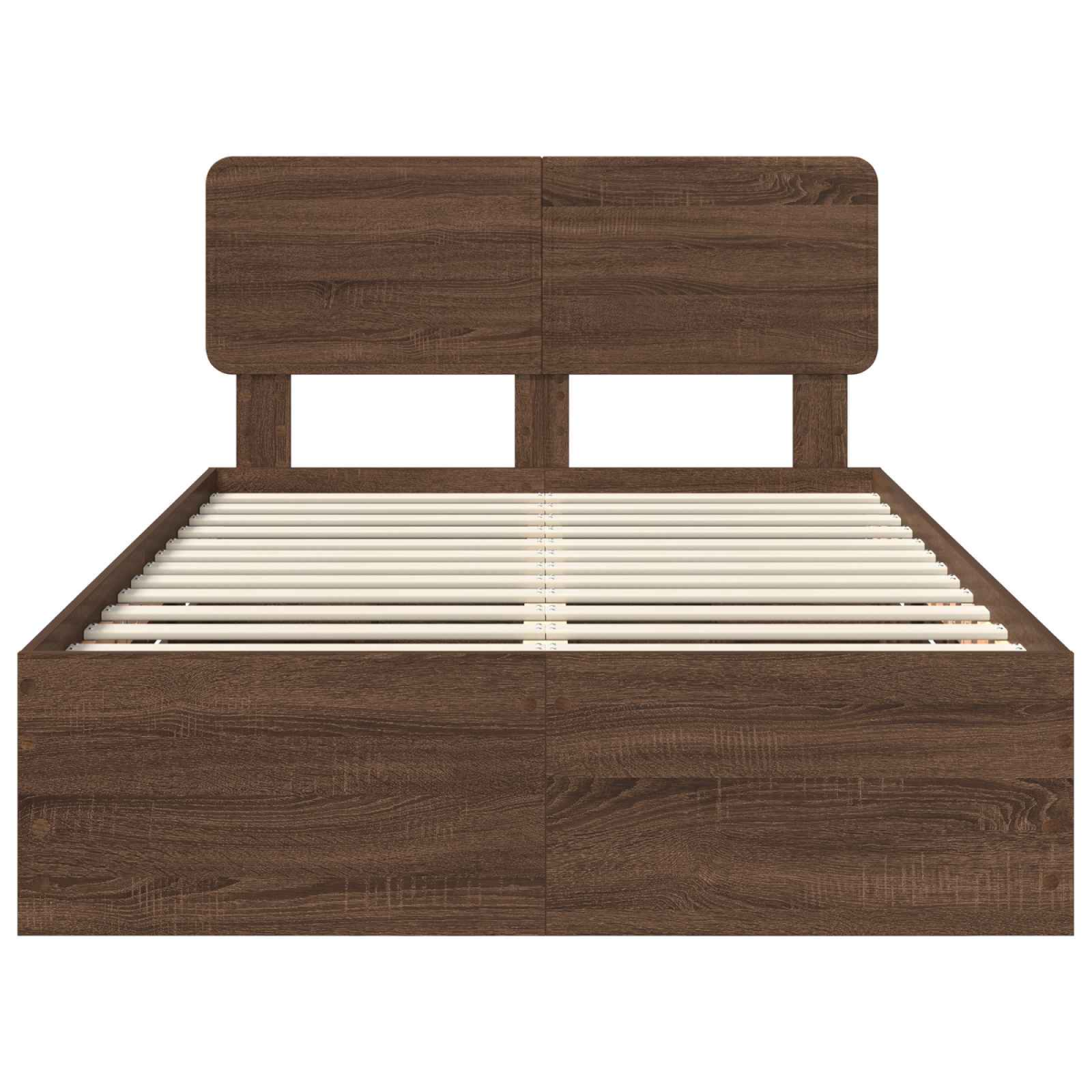 This modern bed frame is a sleek, stylish addition to any bedroom setting. Constructed with simplicity and functionality in mind, it seamlessly blends into contemporary environments, providing a clean, clutter-free aesthetic. With its geometric silhouette and minimalist appeal, the bed frame offers a sophisticated backdrop to your room's decor while providing practical support for a restful night's sleep. Engineered Wood Durability The bed frame is crafted from high-quality engineered wood, known for its resistance to abrasion and everyday wear and tear. This ensures that the bed maintains its sleek appearance and sturdiness over time, providing a reliable platform for your mattress and peace of mind for the user. Fixed Slatted Frame The fixed slatted frame offers a solid support system for your mattress, promoting good ventilation and extending the lifespan of your bedding. The rigid slats provide consistent stability, ensuring a comfortable night's sleep without the need for constant adjustments. Discreet Storage Solutions Hidden within the frame is a secret compartment drawer that provides additional storage space. Ideal for keeping personal items or bedding tucked away, this feature highlights the bed's multifunctional attributes, allowing for a clutter-free room. Engineered Wood Headboard The headboard is meticulously crafted from engineered wood, adding both aesthetic appeal and functionality. It serves as a stable backrest while also enhancing the modern styling of the bed. The warmth and texture of the wood make it a cozy addition to the bedroom ambiance. Effortless Cleaning and Care Maintenance of the bed frame is straightforward: simply wipe down with a damp cloth to keep it looking pristine. This minimal care routine keeps your bed looking new with ease, making it a convenient choice for busy lifestyles.