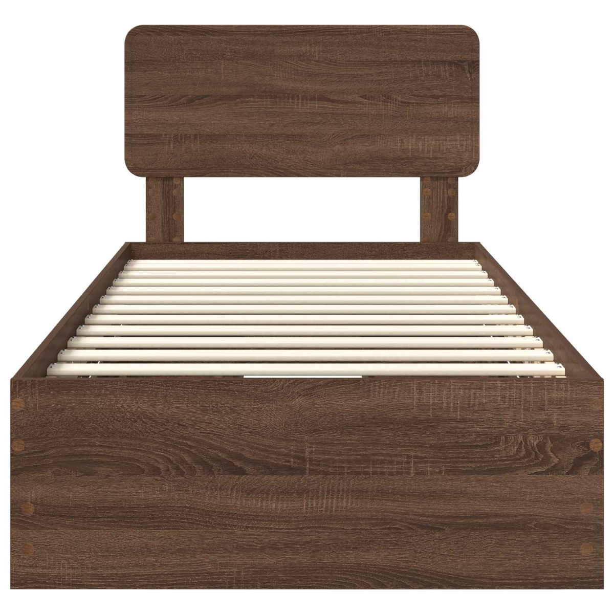 This modern bed frame is a sleek, stylish addition to any bedroom setting. Constructed with simplicity and functionality in mind, it seamlessly blends into contemporary environments, providing a clean, clutter-free aesthetic. With its geometric silhouette and minimalist appeal, the bed frame offers a sophisticated backdrop to your room's decor while providing practical support for a restful night's sleep. Engineered Wood Durability The bed frame is crafted from high-quality engineered wood, known for its resistance to abrasion and everyday wear and tear. This ensures that the bed maintains its sleek appearance and sturdiness over time, providing a reliable platform for your mattress and peace of mind for the user. Fixed Slatted Frame The fixed slatted frame offers a solid support system for your mattress, promoting good ventilation and extending the lifespan of your bedding. The rigid slats provide consistent stability, ensuring a comfortable night's sleep without the need for constant adjustments. Discreet Storage Solutions Hidden within the frame is a secret compartment drawer that provides additional storage space. Ideal for keeping personal items or bedding tucked away, this feature highlights the bed's multifunctional attributes, allowing for a clutter-free room. Engineered Wood Headboard The headboard is meticulously crafted from engineered wood, adding both aesthetic appeal and functionality. It serves as a stable backrest while also enhancing the modern styling of the bed. The warmth and texture of the wood make it a cozy addition to the bedroom ambiance. Effortless Cleaning and Care Maintenance of the bed frame is straightforward: simply wipe down with a damp cloth to keep it looking pristine. This minimal care routine keeps your bed looking new with ease, making it a convenient choice for busy lifestyles.