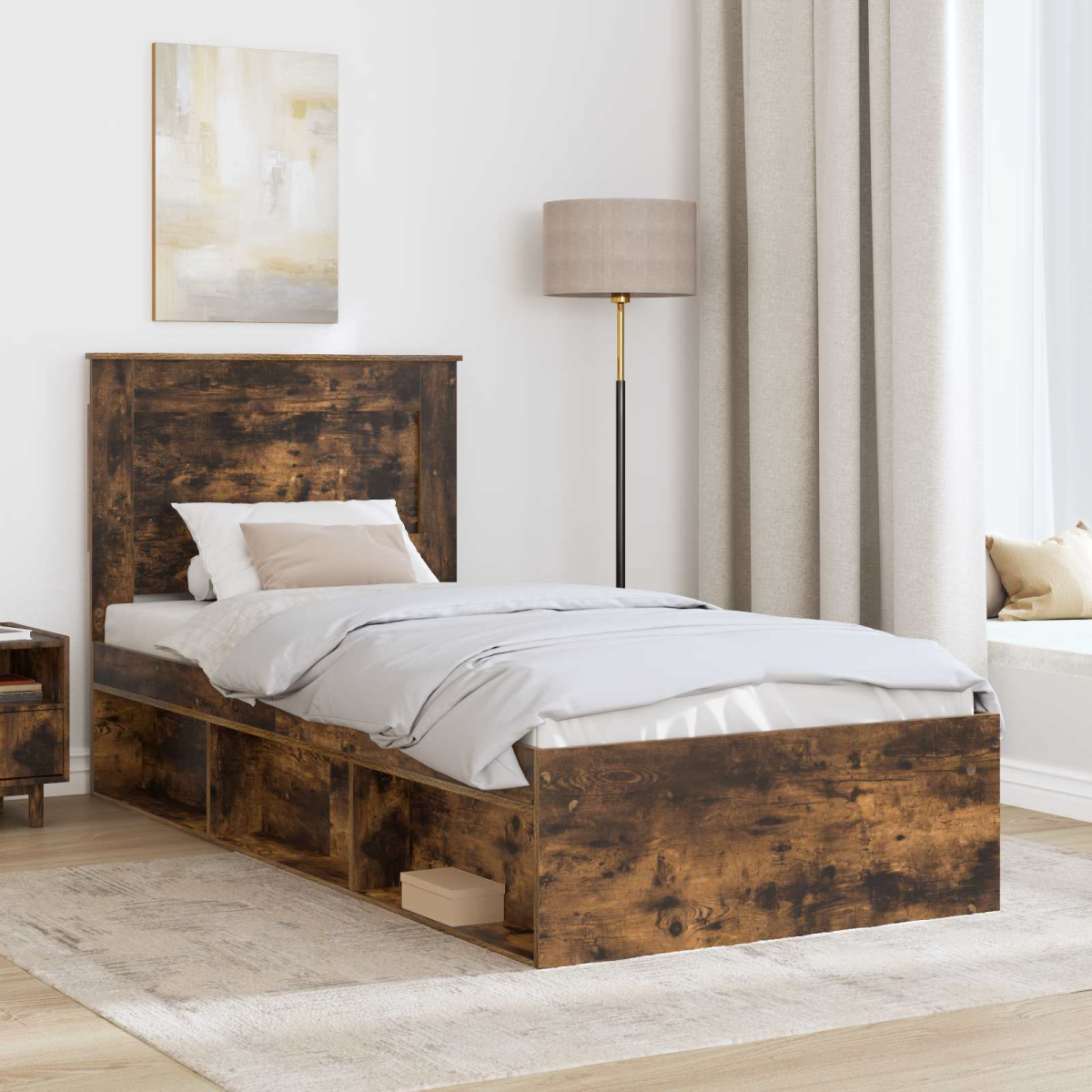 This modern bed frame represents the pinnacle of simplicity and functionality. Crafted for those who desire a clean and organized bedroom space, it offers a sleek, minimalist aesthetic that can easily complement any decor. Its engineered wood frame not only pays homage to modern design principles with its clean lines but also highlights its sturdy and reliable construction. Ideally suited for bedroom settings, this bed frame can become the focal point in a master bedroom or create a sophisticated sleeping area in a guestroom, effortlessly enhancing the look and feel of your personal space. Engineering Excellence: The frame is meticulously crafted from engineered wood, offering a robust and stable base for daily use. Engineered wood is selected for its strength and durability, providing support and longevity in any bedroom setup. This choice of material ensures that the frame maintains its integrity over years of use, conveying confidence in the product's lasting value. Component Detail: The bed frame includes a fixed slatted frame and a solid pine wood headboard, both designed to offer exceptional support and comfort. The slatted frame promotes mattress ventilation and helps retain the bedding's condition. The headboard, crafted from premium pine, completes the unit with elegance and utility, enhancing the overall aesthetic of the bed. Functionality First: Featuring an easy-clean surface, this bed frame caters to practical needs without compromising on style. The straightforward maintenance allows users to keep the furniture pristine with minimal effort, making it an excellent choice for busy households or professionals seeking convenience in bedroom furnishings. Recommended Uses: Suitable for use in bedrooms of various styles, from modern to transitional. This frame can adapt comfortably to a master suite, a cozy guestroom, or a teenager's space. Its understated style ensures it blends effortlessly, accommodating a variety of bedding themes and room sizes. Care Instructions: To maintain its finish, it is essential to regularly wipe the bed frame with a damp cloth. Avoid the use of harsh chemicals that can damage the material. Following these care instructions will help preserve the bed's appearance and function, ensuring continued satisfaction over time.