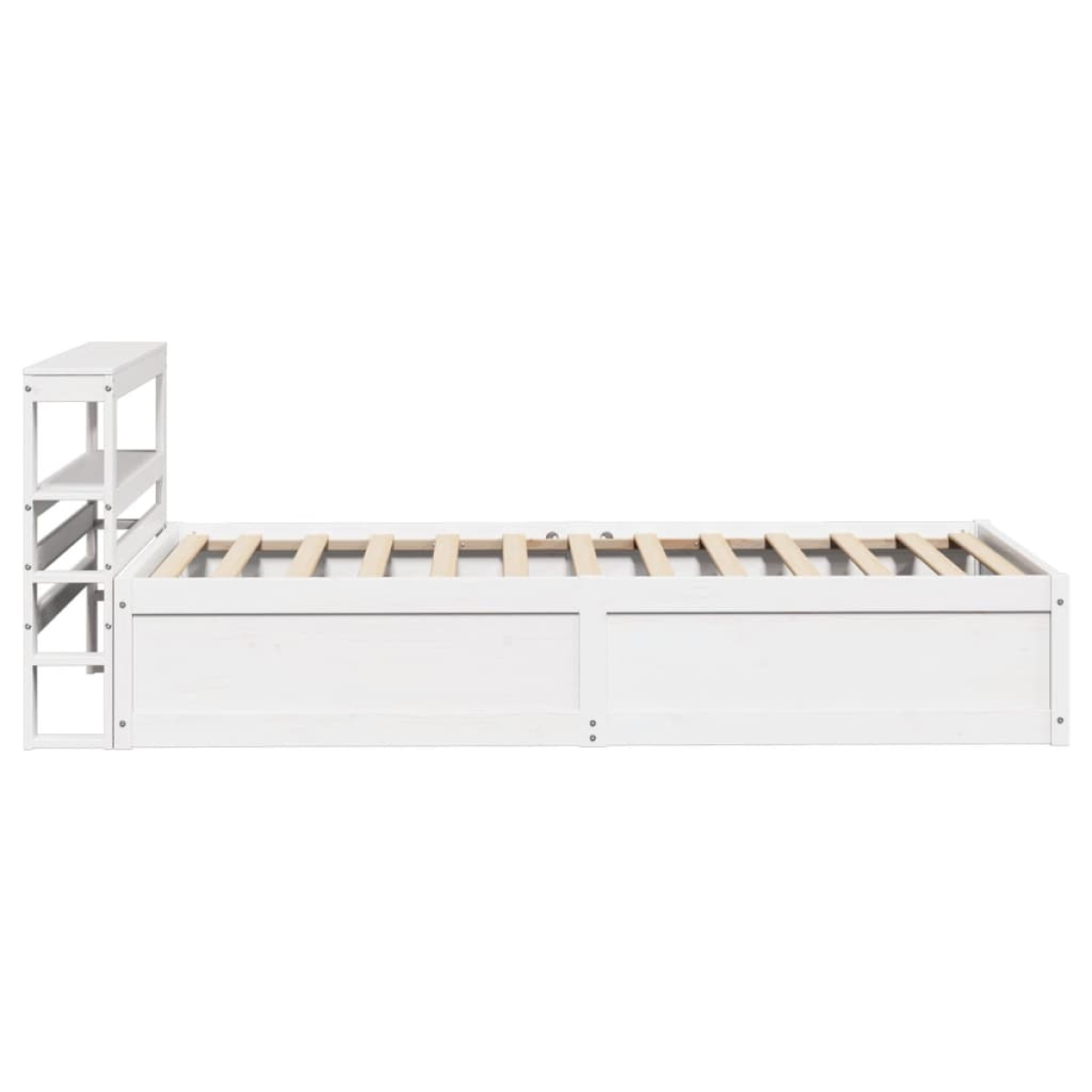 Get a better restful night's sleep from this bed frame! It makes a welcoming addition to any bedroom. Stable and long-lasting frame: Solid pinewood is known for its strength and durability. Its straight grains and distinctive knots contribute to its rustic charm.Slatted base for optimal support: The bed frame is equipped with a slatted base for support and breathability for your mattress.Ample storage space: This sleek headboard of the bed features two convenient shelves, offering ample storage space to keep all your nighttime essentials within easy reach.Freestanding headboard: The freestanding headboard offers a hassle-free solution for effortless placement and repositioning without the need for wall installation. Good to know:A mattress is not included with this bed. We do offer a various selection of mattresses. You can check our shop for a matching mattress.