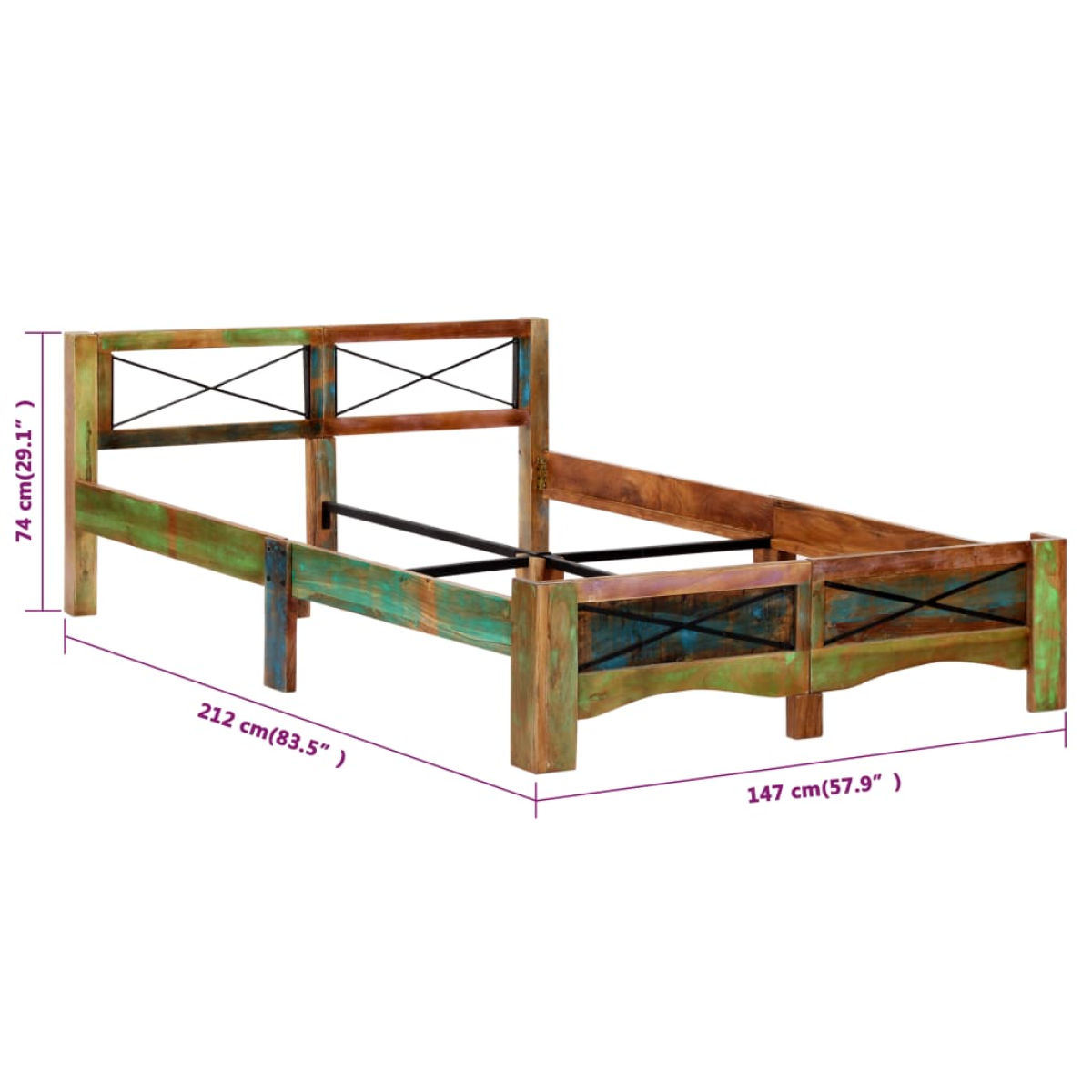This wooden bed frame exudes a vintage charm and will be the centre of attraction for your bedroom. This antique- style bed frame is made of solid reclaimed wood that has been sourced from joists, floors and support beams from old buildings being demolished, and it can consist of different types of wood like pine, teak, beech, oak, cedar, mango wood, acacia, etc. This means the reclaimed wood retains the characteristics of these different types of wood. Reclaimed wood is already aged, weathered and dried, so it doesn't shrink or bend. As a consequence, this beautifully-designed bed is exceedingly stable, durable and eye-catching. Additionally, the exquisite craftsmanship and the graceful wood grains make every piece of furniture distinctive and slightly different from the next. Please note that mattress is not included in the delivery. Important note: The colours vary from piece to piece, making each piece unique. The delivery is random, ensuring the exclusivity and individuality of your product.