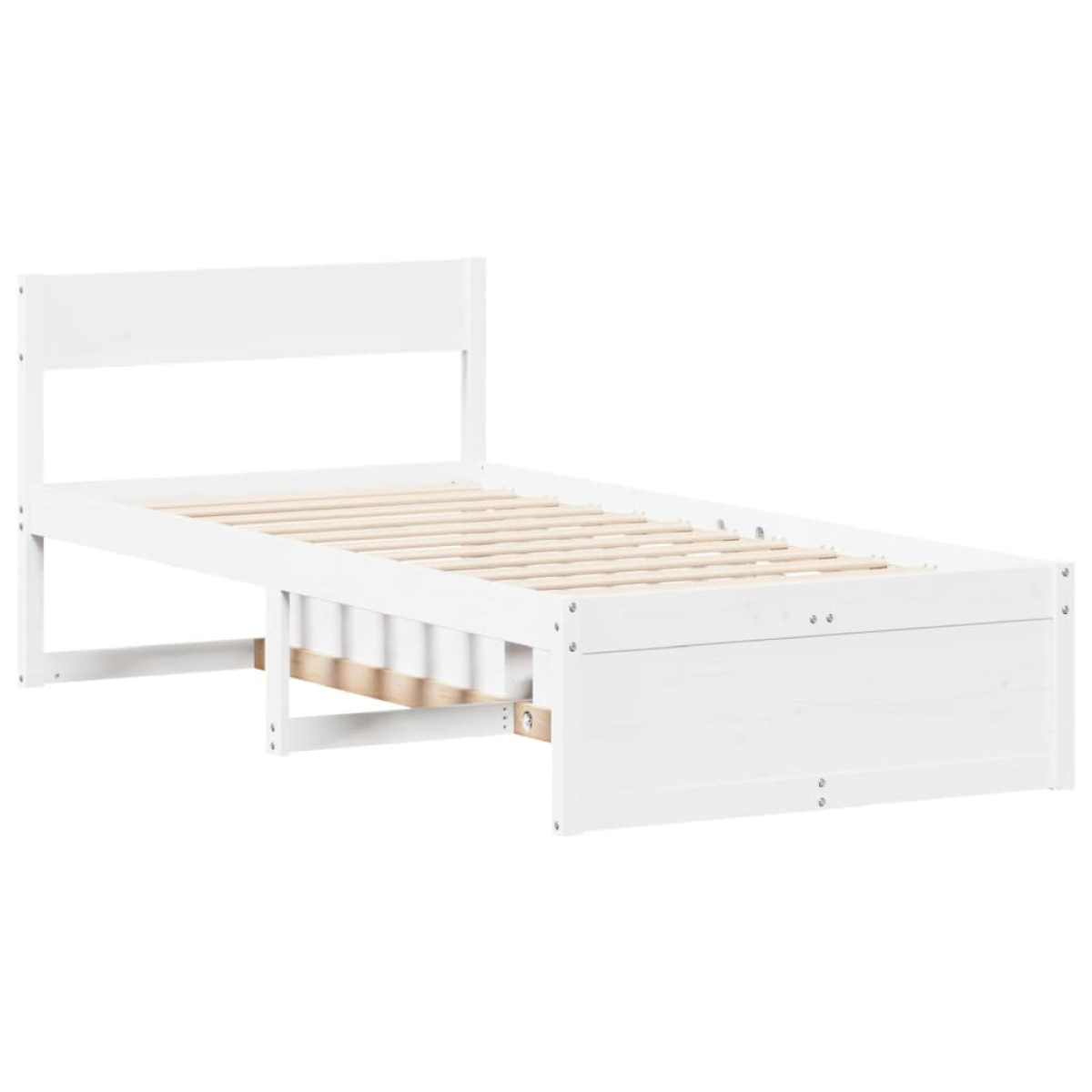 Get a better restful night's sleep from this bed frame! It makes a welcoming addition to any bedroom. Stable and long-lasting frame: Solid pinewood is known for its strength and durability. Its straight grains and distinctive knots contribute to its rustic charm.Slatted base for optimal support: The bed frame is equipped with a slatted base for support and breathability for your mattress.Make full use of space: This bed frame features two drawers underneath, providing storage for items like extra bedding, seasonal clothing, and toys.Ample storage space: This sleek headboard of the bed features two convenient shelves, offering ample storage space to keep all your nighttime essentials within easy reach.Freestanding headboard: The freestanding headboard offers a hassle-free solution for effortless placement and repositioning without the need for wall installation. Good to know:A mattress is not included with this bed. We do offer a various selection of mattresses. You can check our shop for a matching mattress.