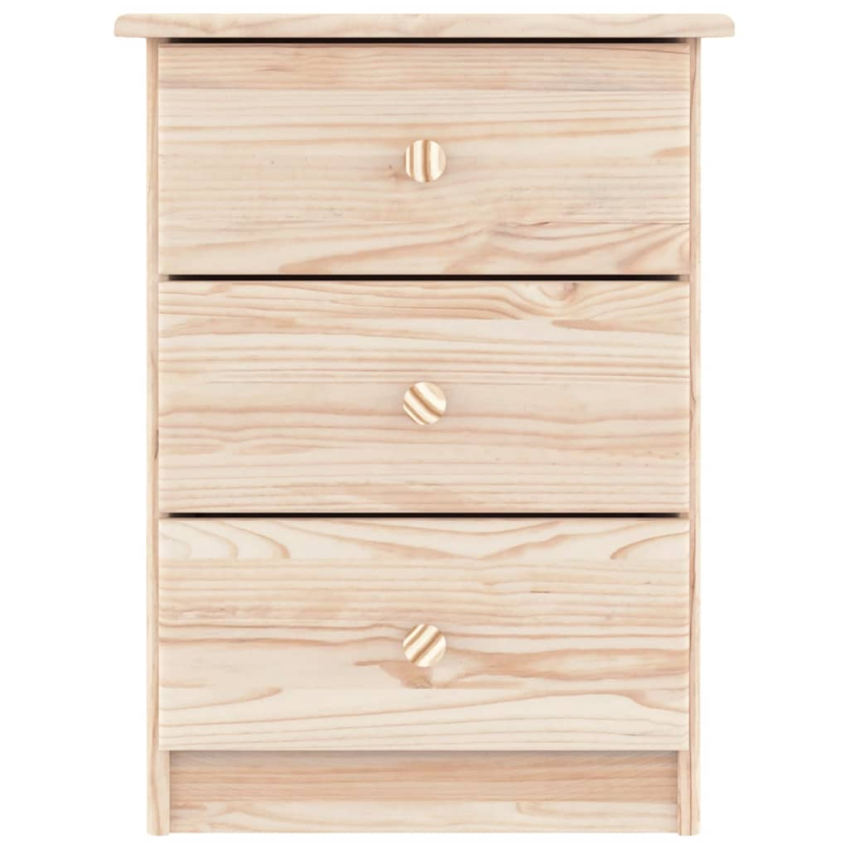 With a stylish design, this wooden bedside cabinet fits easily into your bedroom or living room and adds a timeless charm to your interior. Solid pine wood: Solid pine wood is a beautiful natural material. Pine wood has a straight grain, and the knots give the material its signature, rustic look. Made of solid pine wood, the bedside table is durable and sturdy.Ample storage space: The bedroom furniture features 3 convenient drawers, helping keep your essentials close at hand.Easy to maintain: The bed side table is easy to clean with a damp cloth and requires less maintenance.Wooden knobs: The bedside drawer comes with wooden knobs that make it easy to open and close the bed table while also adding to extra beauty.Untreated surface: As the nightstand is crafted from solid pine wood with no finish, you can keep its natural colour, but also can paint or lacquer it as you prefer. Warning:To prevent it being overturned, this product must be used with the provided wall attachment device.