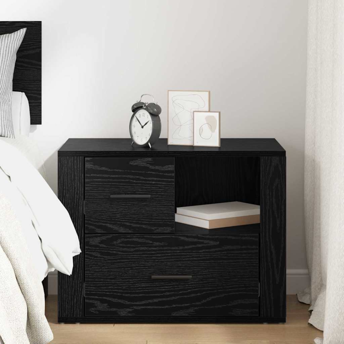 This bedside cabinet is the epitome of modern style, perfect for chic bedrooms or living areas. With its sleek lines and minimal fuss, it fits right into any decor and makes life easier by keeping your daily essentials organised. Materials: Crafted from tough engineered wood, this cabinet is built to last, holding up well against daily use and keeping a timeless look. The textured surface adds a modern touch while being easy to maintain. Included Components: The cabinet has board shelves from engineered wood, offering loads of space for your stuff, like books and nighttime essentials. The weathered finish gives it a charming, rustic vibe that adds character to your space. Features / Function / Design: With storage in mind, it has plenty of options like compartments and traditional drawers, catering to those who need a mix of style and utility for their home. Recommended Uses: This cabinet is ideal for use in the bedroom or living room as a side table. It's perfect for lamps, alarm clocks, and personal items, making organised storage accessible in a compact form. Care & Maintenance: Keeping this cabinet looking good is easy. Just wipe it with a dry cloth to clear dust, and steer clear of harsh chemicals that could ruin the finish. Following these tips will keep your cabinet chic and stylish.