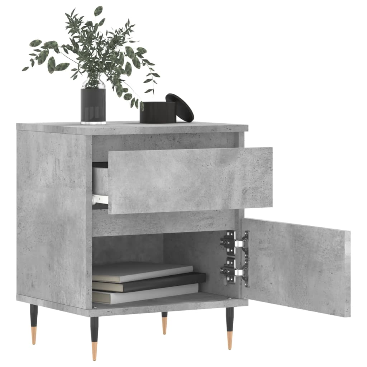 This trendy bedside cabinet, featuring a sleek and classic design, is meant to upgrade your interior to the next level. Durable material: The engineered wood is of exceptional quality with smooth surface and also features strength, stability and resistance to moisture. Made of engineered wood, the bedside table is easy to clean with a damp cloth.Ample storage space: The bed side table has a drawer and a compartment with a door, providing ample space to keep your magazines, books, remote controls and other small items well organised and within reach.Sturdy top: The sturdy top of the nightstand is ideal for displaying decorative objects, photo frames and potted plants.Metal legs: The metal legs add a modern and calm style to your interior while ensuring stability. Warning:To prevent it being overturned, this product must be used with the provided wall attachment device.