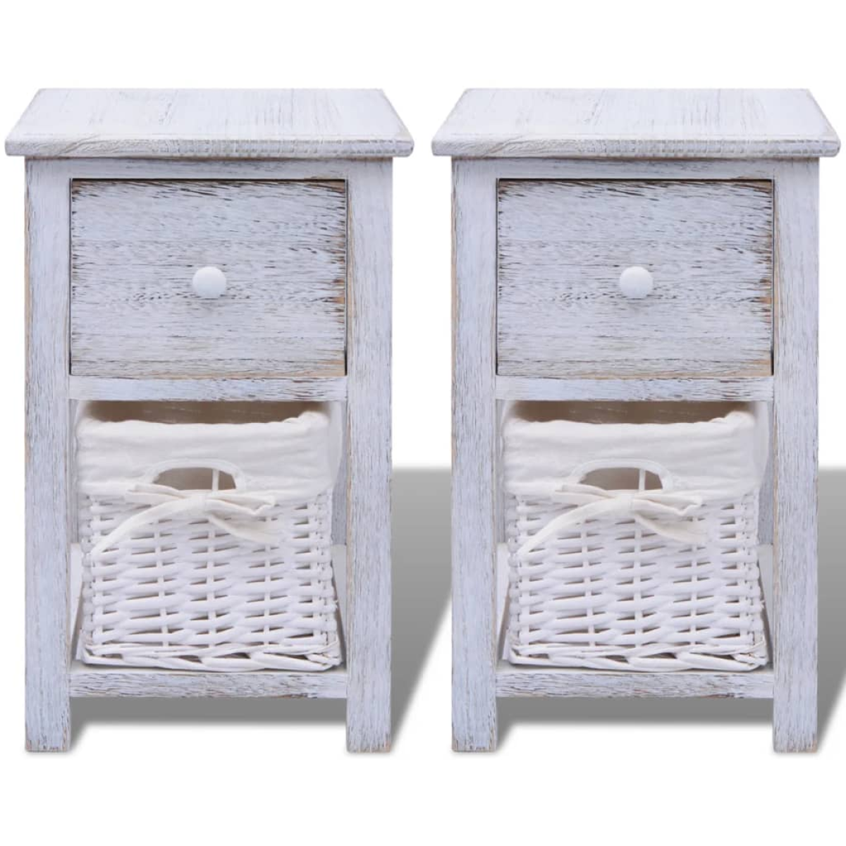 Add a touch of rustic charm to your home with these chic wooden bedside cabinets! They can also be used as telephone stands, side cabinets, small cabinets, drawer cabinets, storage cabinets, nightstands, night cabinets, bedroom cabinets, end tables, end cabinets, etc. These compact cabinets each have a smoothly running drawer, which provides ample space for keeping smaller items organised and within reach. Beneath the drawer, you will find a removable wicker basket for extra storage space. The fabric liner of the baskets can be removed and washed. Delivery includes 2 bedside cabinets.