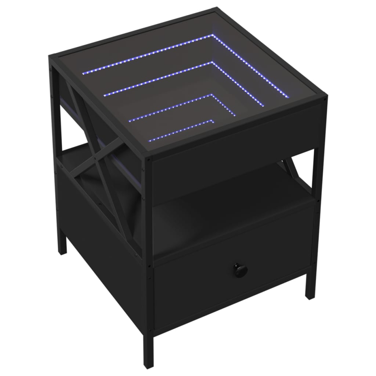 This bedside table with an LED infinity mirror makes a timeless addition to your interior decor. Stable and durable material: Engineered wood is a durable and stable material with a smooth surface that is resistant to moisture, warping, and splitting, making it a reliable choice for a variety of projects. Sturdy frame: The metal frame of the table adds an industrial style to your interior while ensuring sturdiness, stability, and longevity. RGB LED Lights for a pleasant ambience: This table features LED lights that can be easily adjusted to create a personalised light show. You can customise the modes, colours, and brightness to enhance the ambience of your interior space.Stable and sturdy tabletop: The sturdy tabletop is ideal for placing your decorative items, or any other necessities you need close at hand. Good to know: The product has a USB connector that requires a certified 5V USB power source (not included).