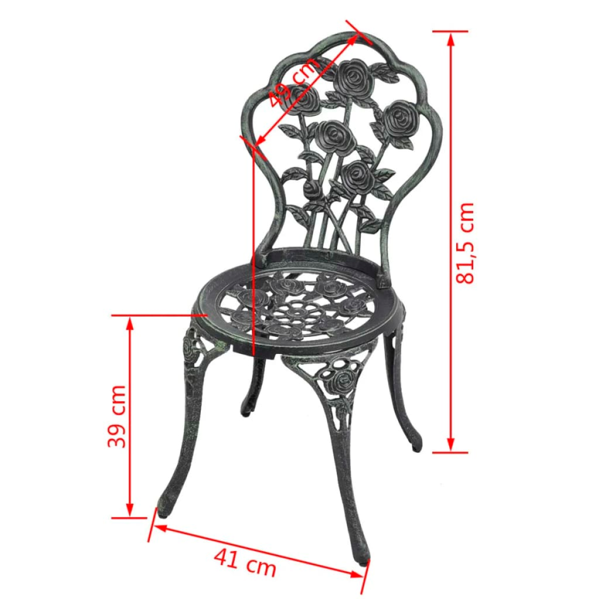 This set of bistro chairs will make a decorative addition to your garden, patio, or balcony with their ornate floral details. It will be a pleasure to have a cuppa with your friends sitting on these chairs! The bistro set is made of high-quality cast aluminium, which is weather-resistant and highly durable. The cast iron legs add to the sturdiness of the set. The detailed floral pattern will add a romantic touch to any garden, patio or conservatory. Delivery includes 2 bistro chairs.